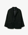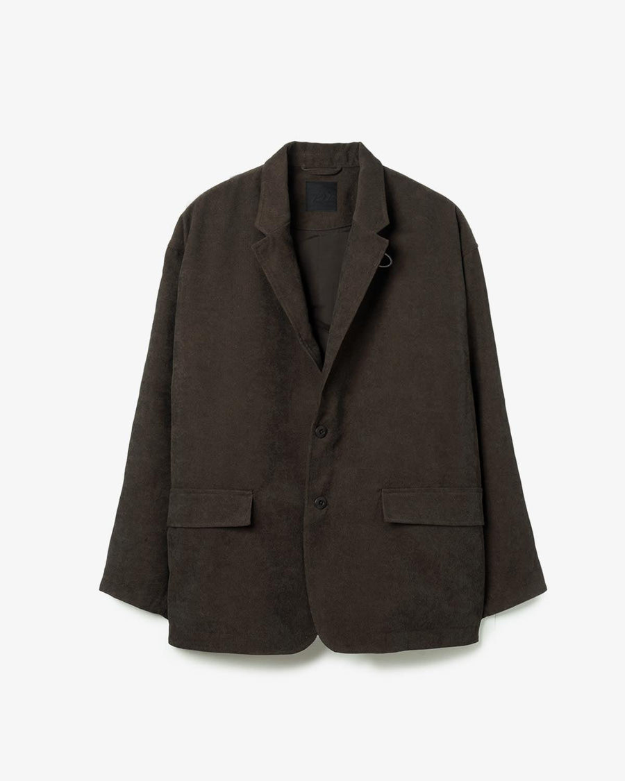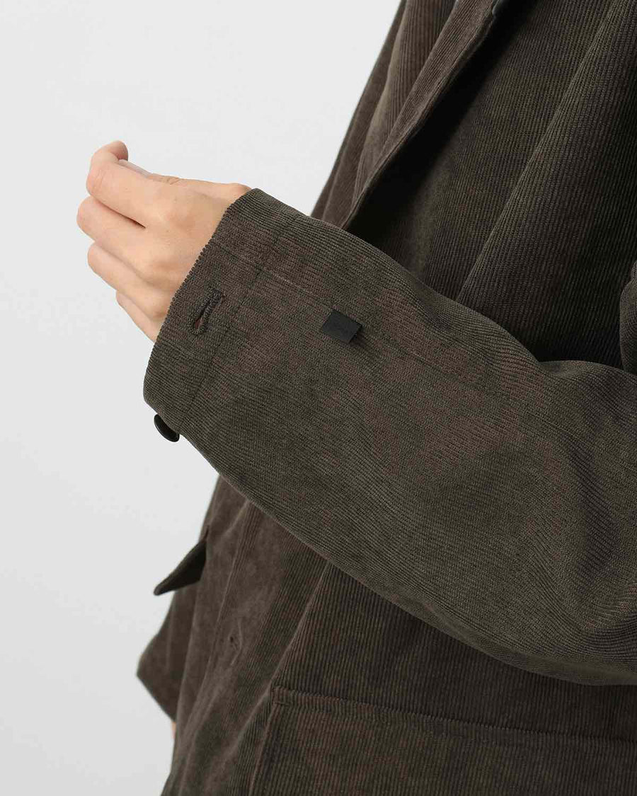 This 2B jacket is made from fine corduroy with a durable polyester blend, featuring an oversized silhouette and functional details inspired by hunting jackets, like large flap pockets.