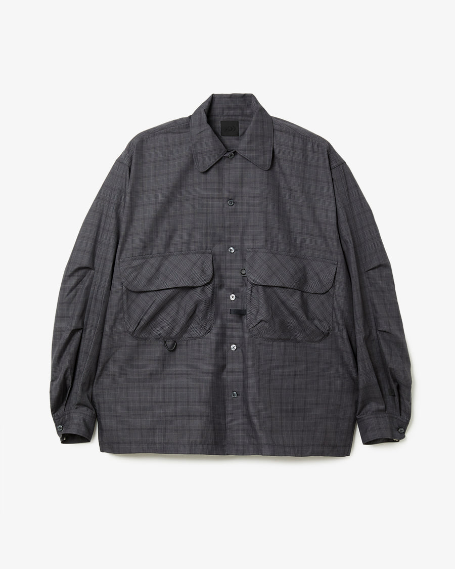 This cotton-touch twill open-collar shirt features fishing-inspired wide flap pockets and asymmetrical inner pockets for added utility.