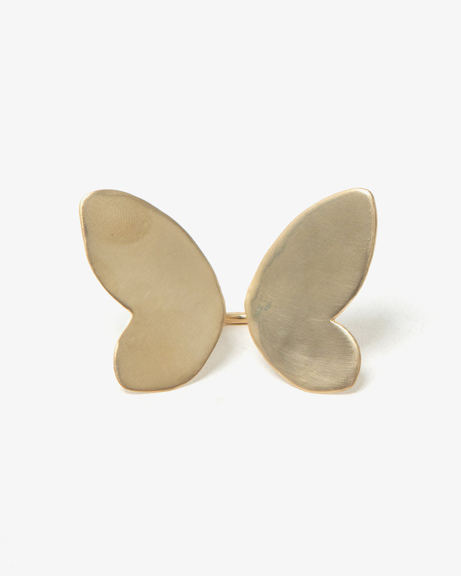 Ring featuring a large motif of a butterfly with its wings spread as if it has landed on your finger. There may be slight differences between each item due to its handmade nature.