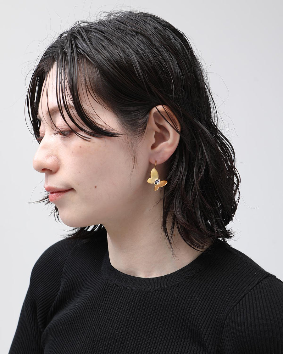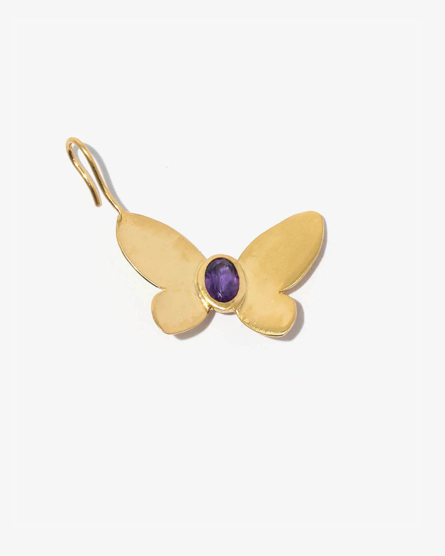 A single earring with a Amethyst embedded in it, with a motif of a butterfly spreading its wings.