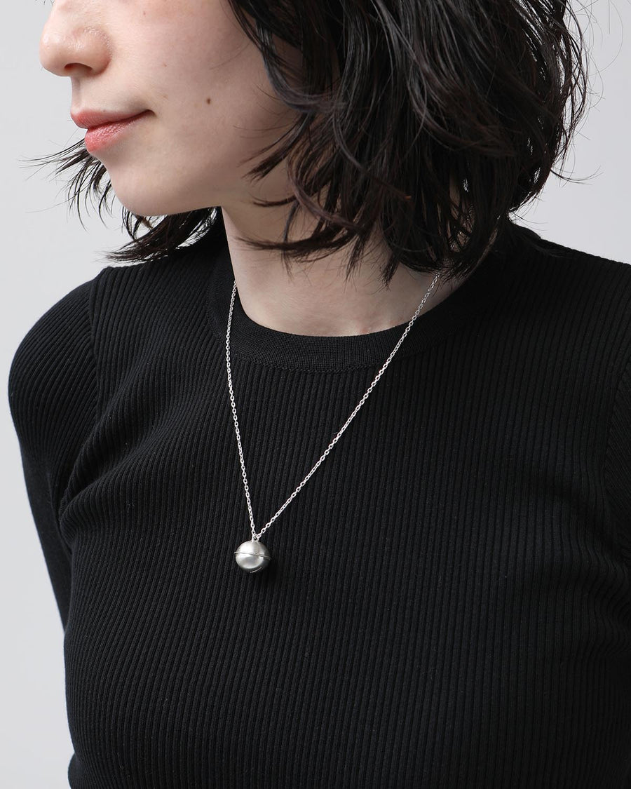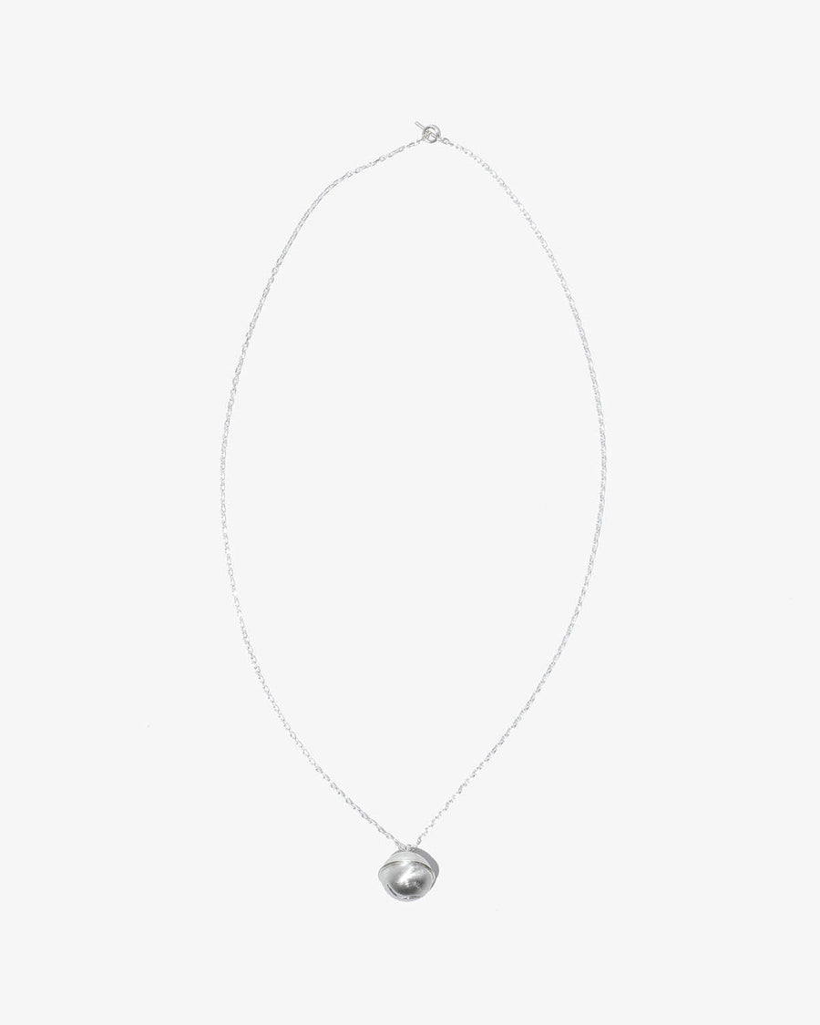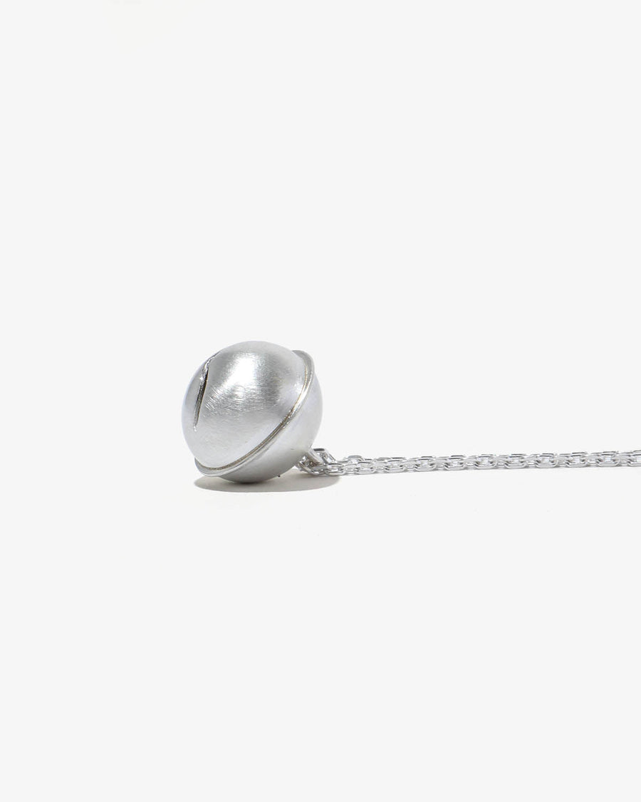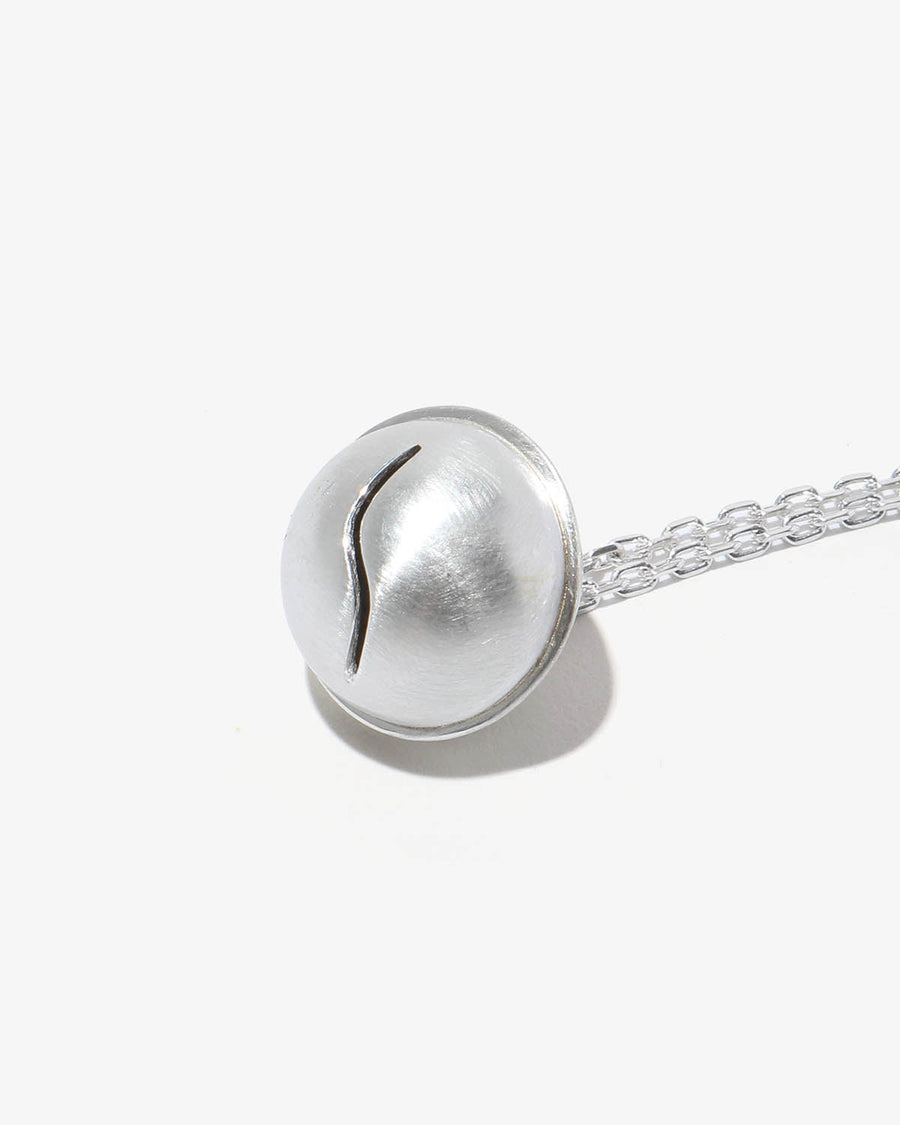 A necklace featuring a charming, rounded bell motif. Designed to produce a delicate chime, believed to offer protection.
