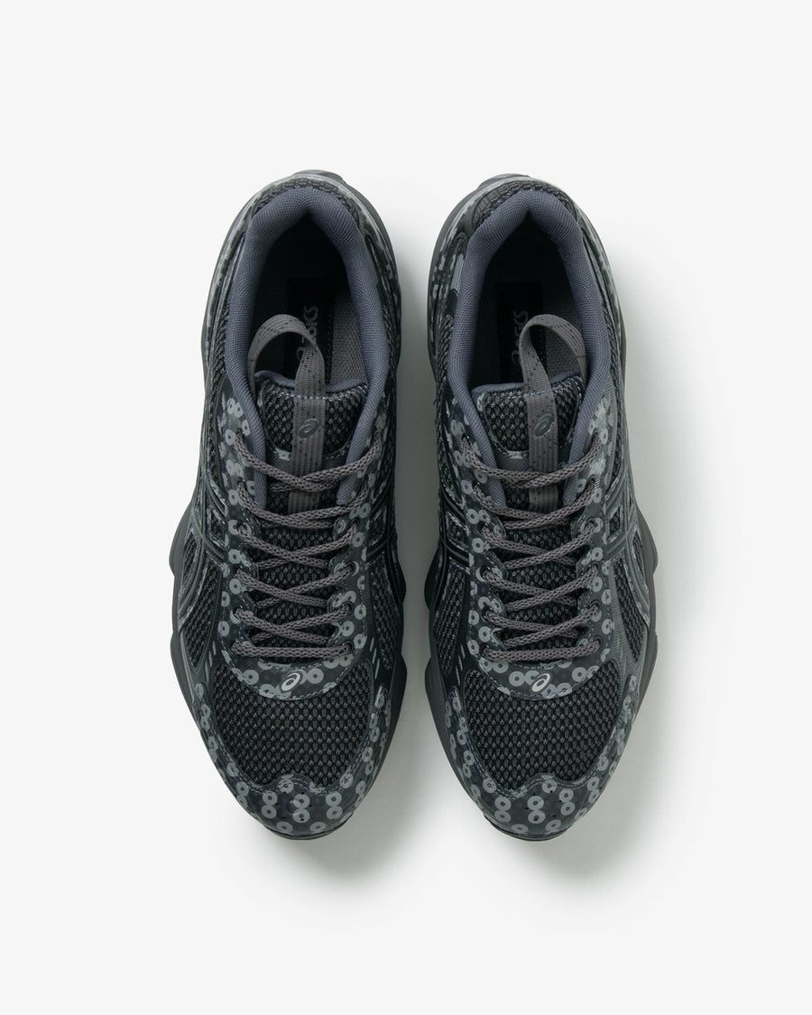 Kiko Kostadinov × ASICS “US7-S GEL-KINETIC FLUENT” with warm, textured patterns. Upper with 2010s running shoe details; FF BLAST PLUS & Scutoid GEL midsole for comfort and rebound.