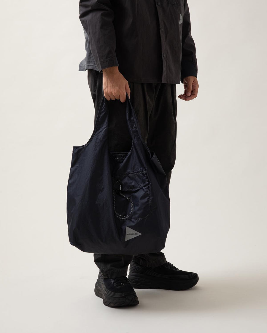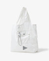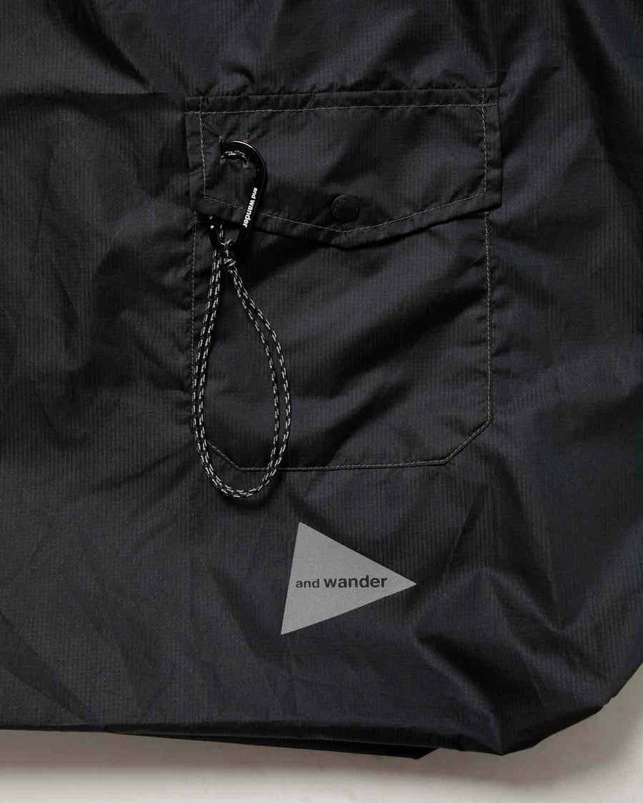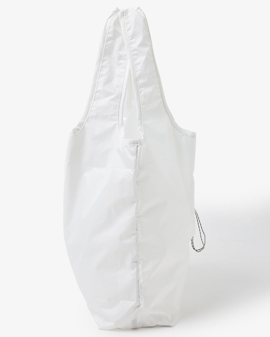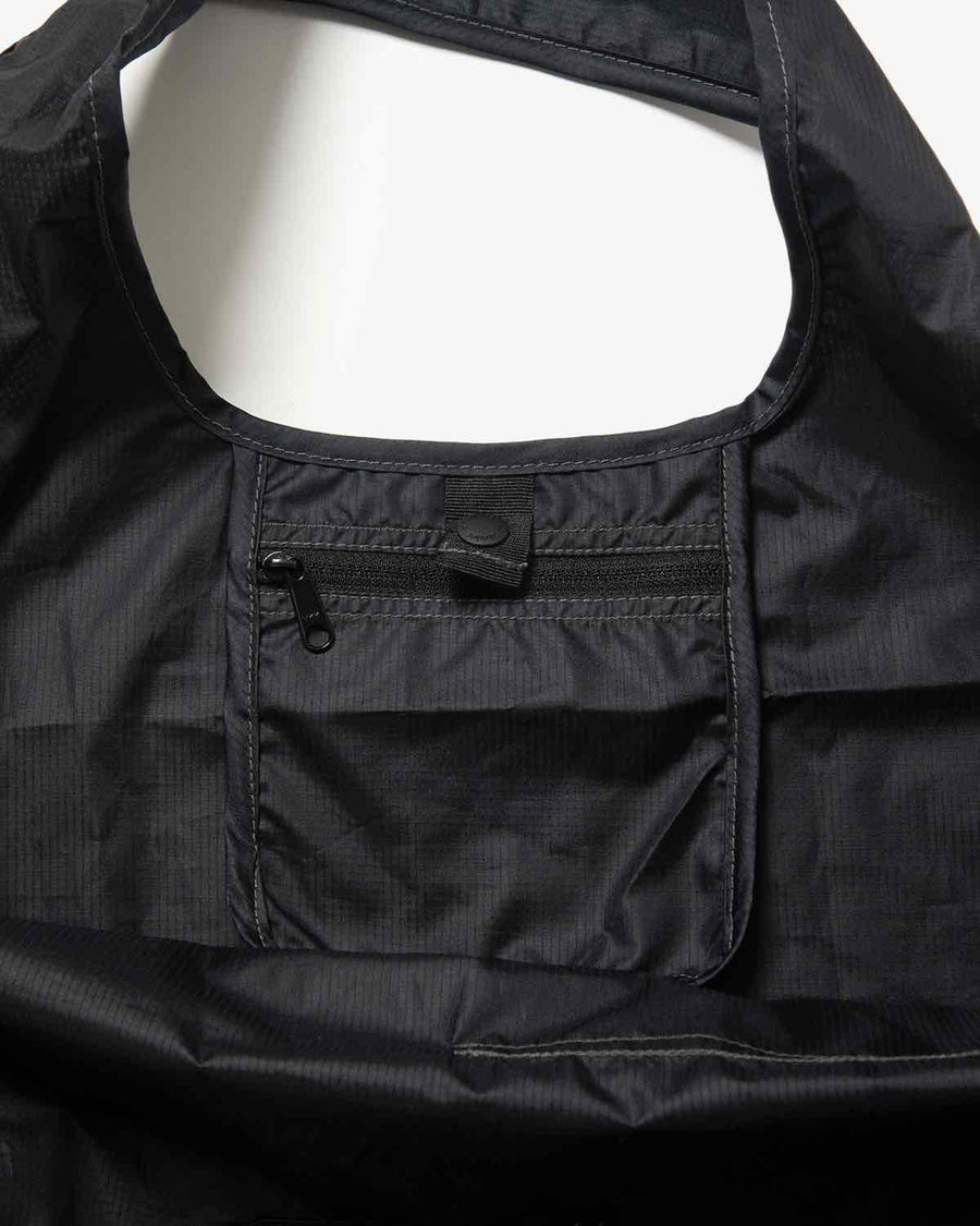 An eco-friendly packable bag made from silicon-coated CORDURA nylon and water-repellent recycled polyester fibers, featuring an inner pocket for compact storage.