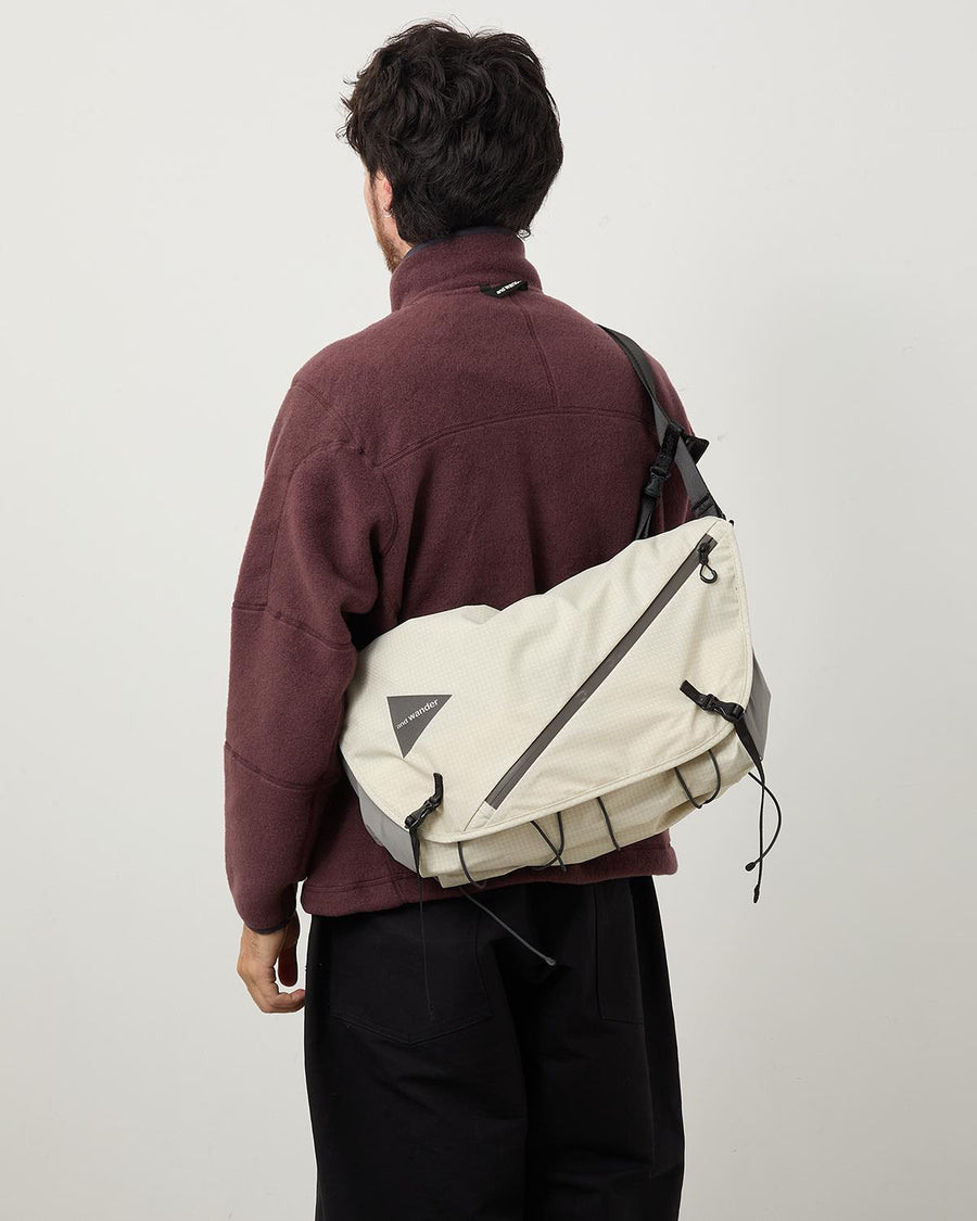 A 17L messenger bag made from recycled nylon and high-strength polyethylene ripstop fabric, with a recycled polyester lining, combining durability and sustainability.