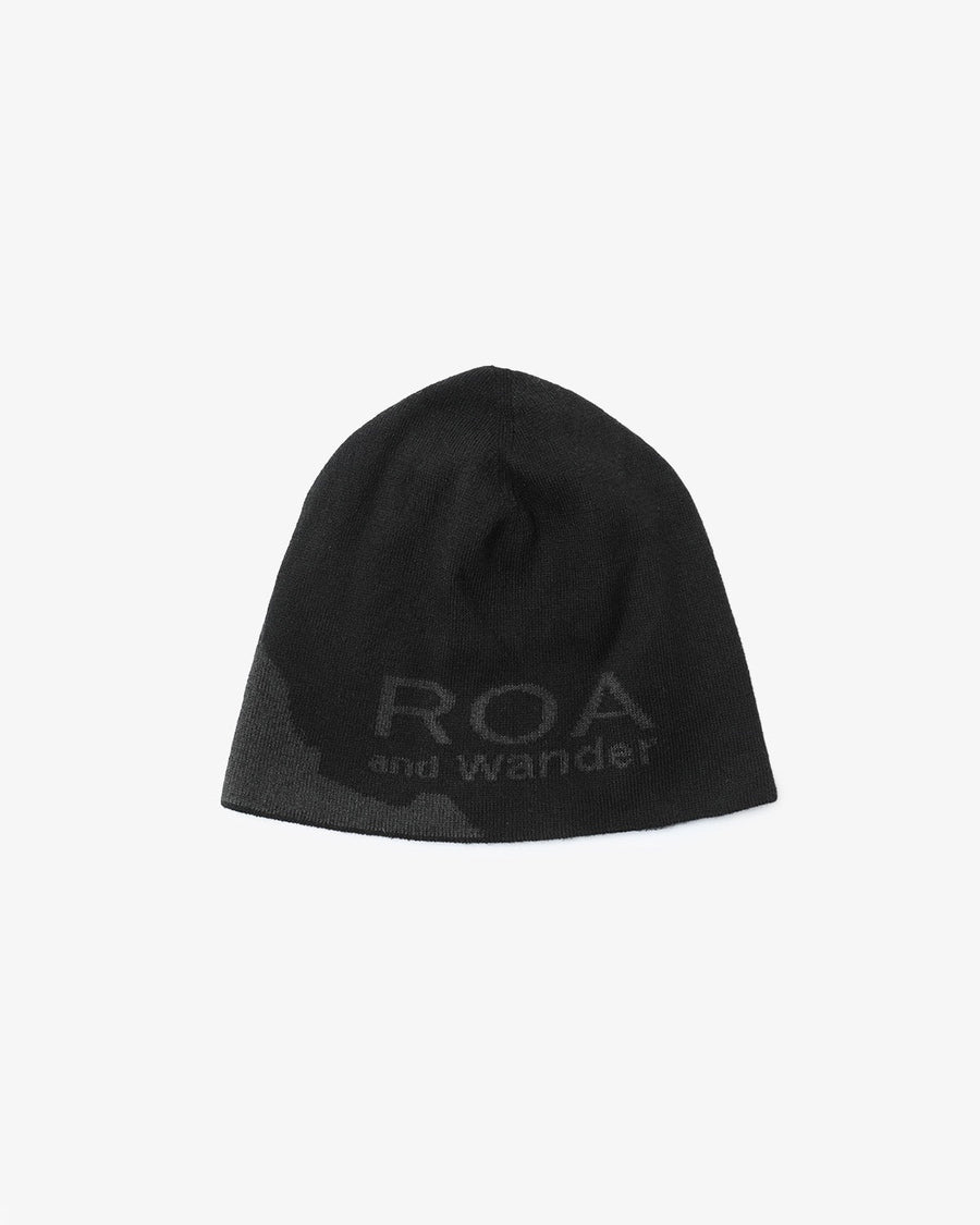 A beanie from ROA × and wander, garment-dyed and made from organic Biofil® cotton for a soft, warm feel, featuring an oversized logo design.