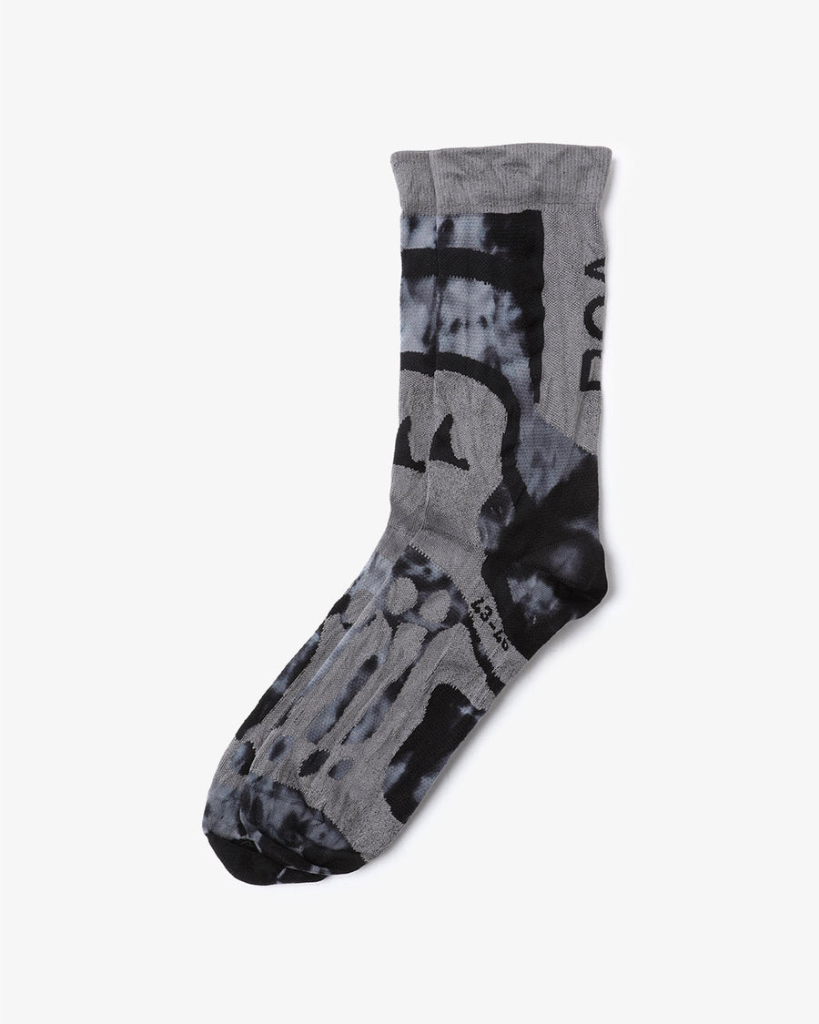 Technical knee-high socks from ROA × and wander, made with breathable knit fibers for comfort, featuring a “Bones” design on the instep and logos from both brands.