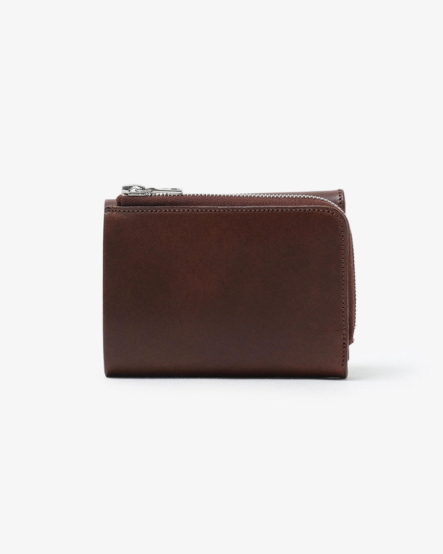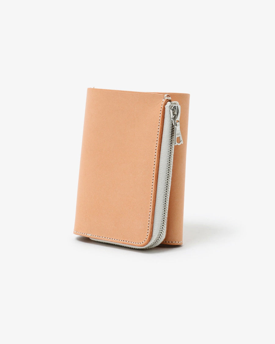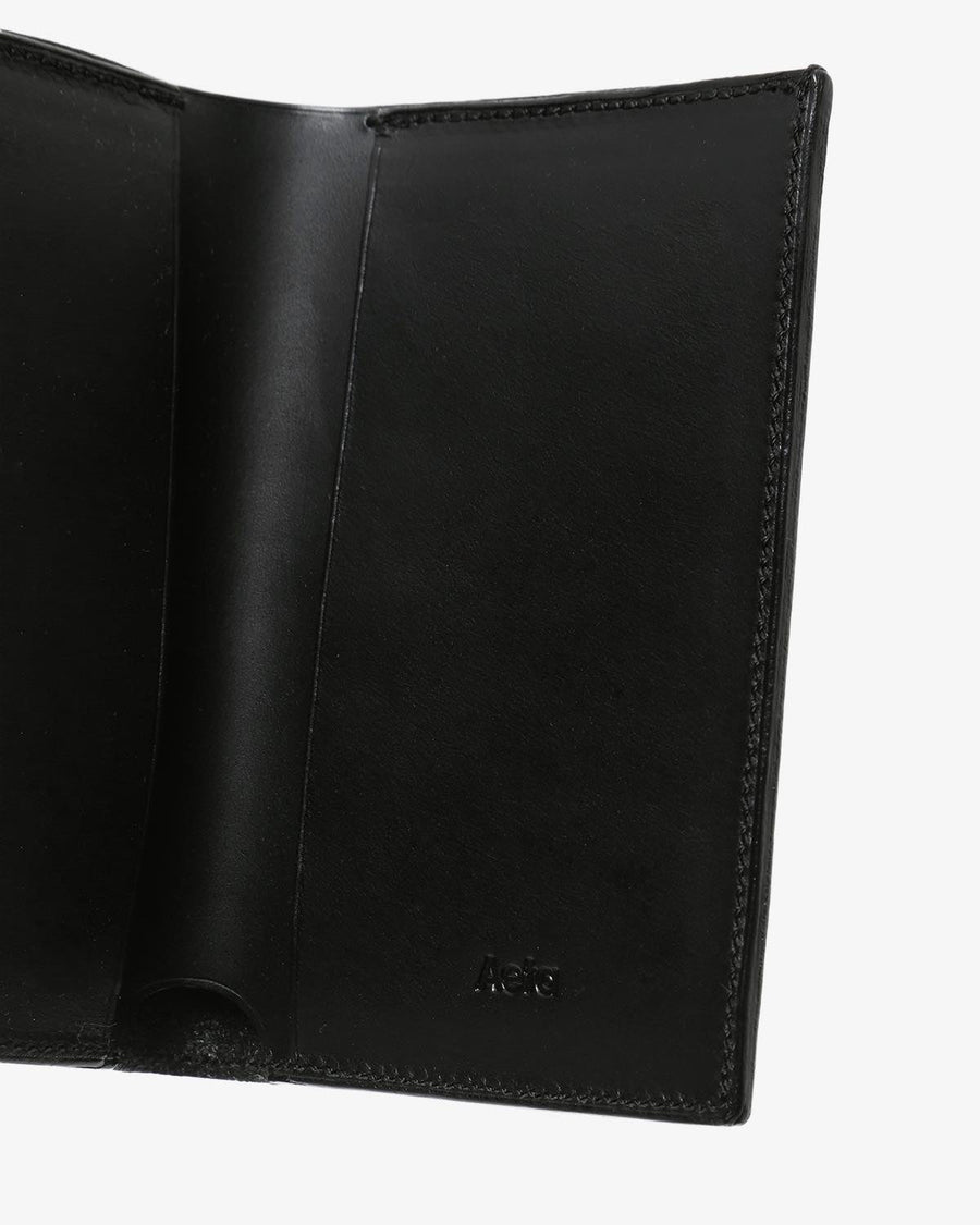 A compact wallet made from vegetable-tanned cow leather, featuring a minimalist design typical of 〈Aeta〉 with bill, coin, and card compartments.
