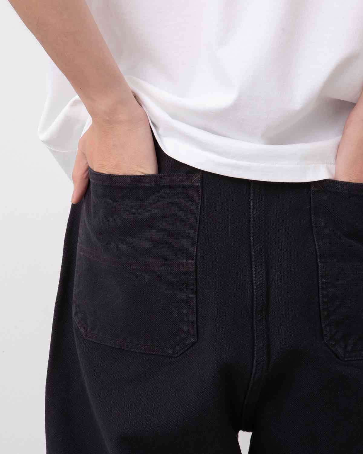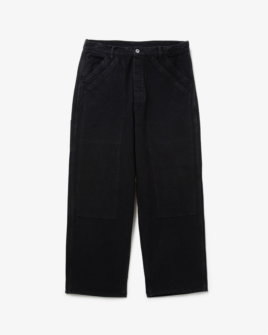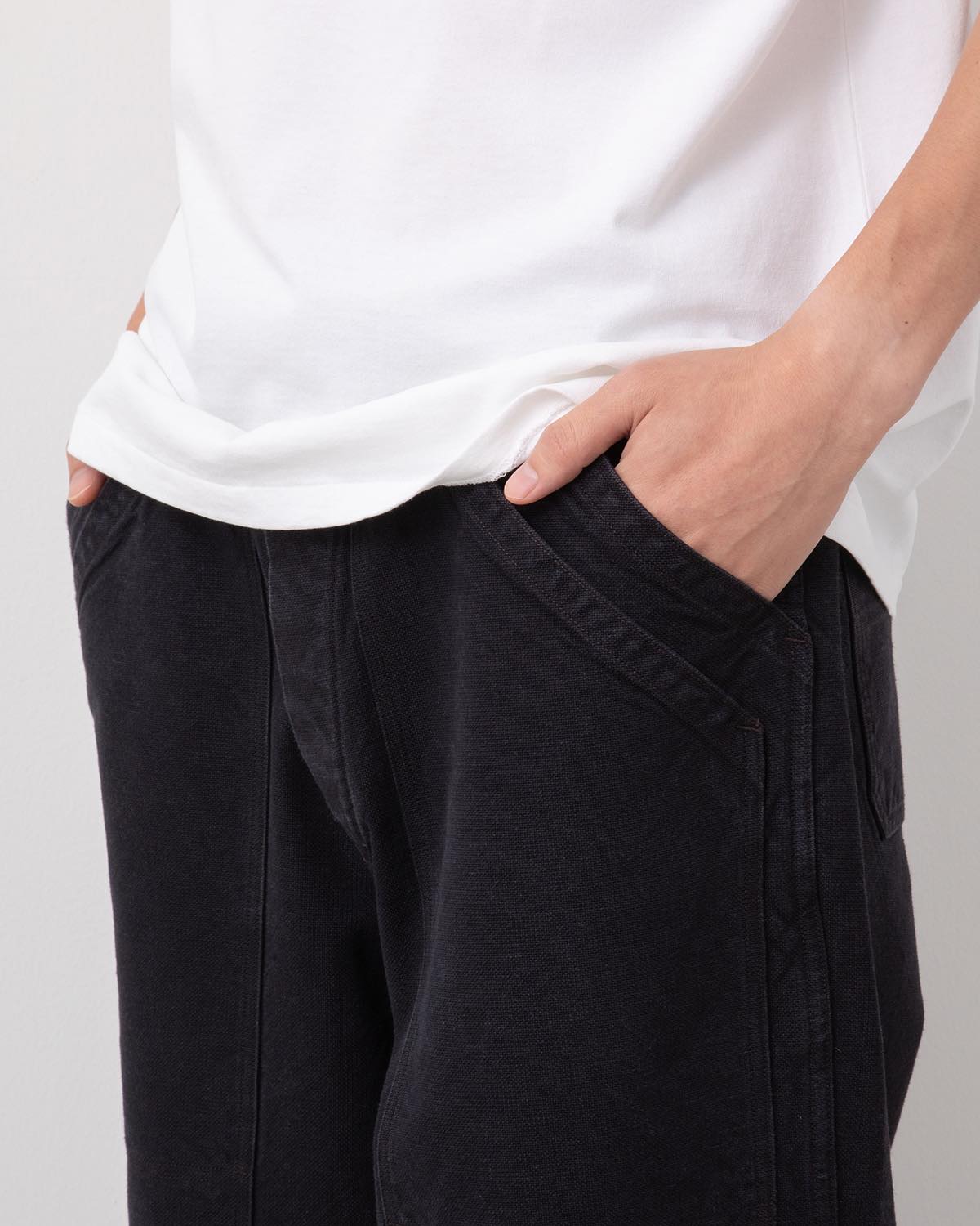 The VINTAGE SILK HEMP DOUBLE KNEE PANTS blend silk, cotton, and hemp for firm yet soft fabric, with a wide fit and unique connected knee patches and double waist pockets.
