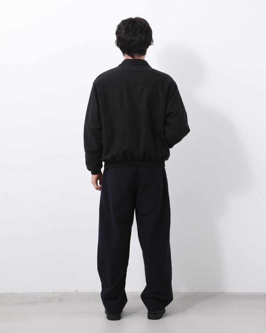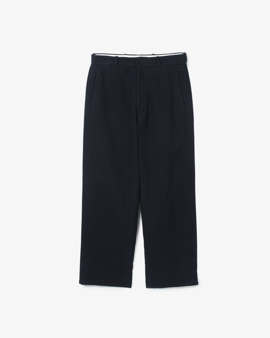 古い時代のアメリカントラディショナルブランドのノープリーツワイドトラウザーズをベースに製作した「VINTAGE COTTON SILK MOLESKIN WIDE TAPERED TROUSERS」です。