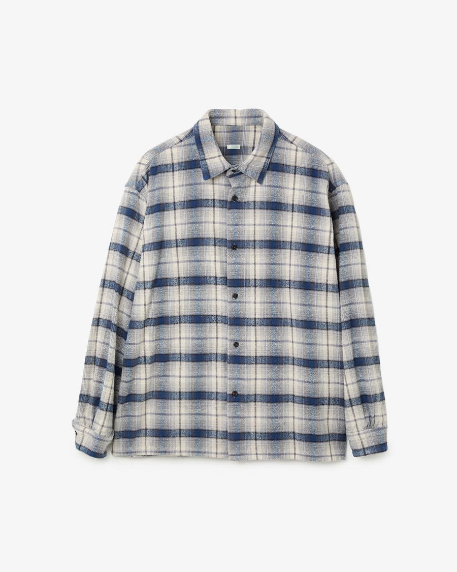 Relaxed-fit French front shirt with a regular collar, made from cotton-silk blended flannel check. Over-dyed and washed to mimic natural aging, with a square-tail hem for easy layering.