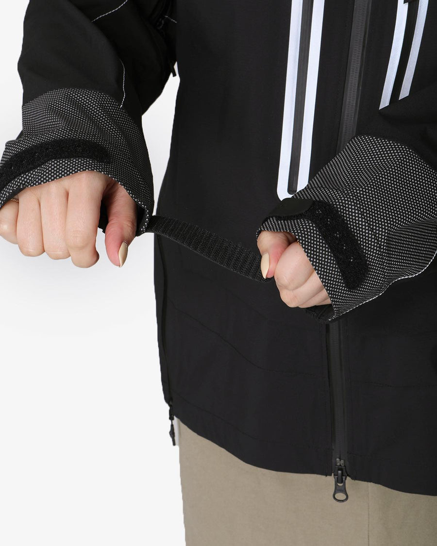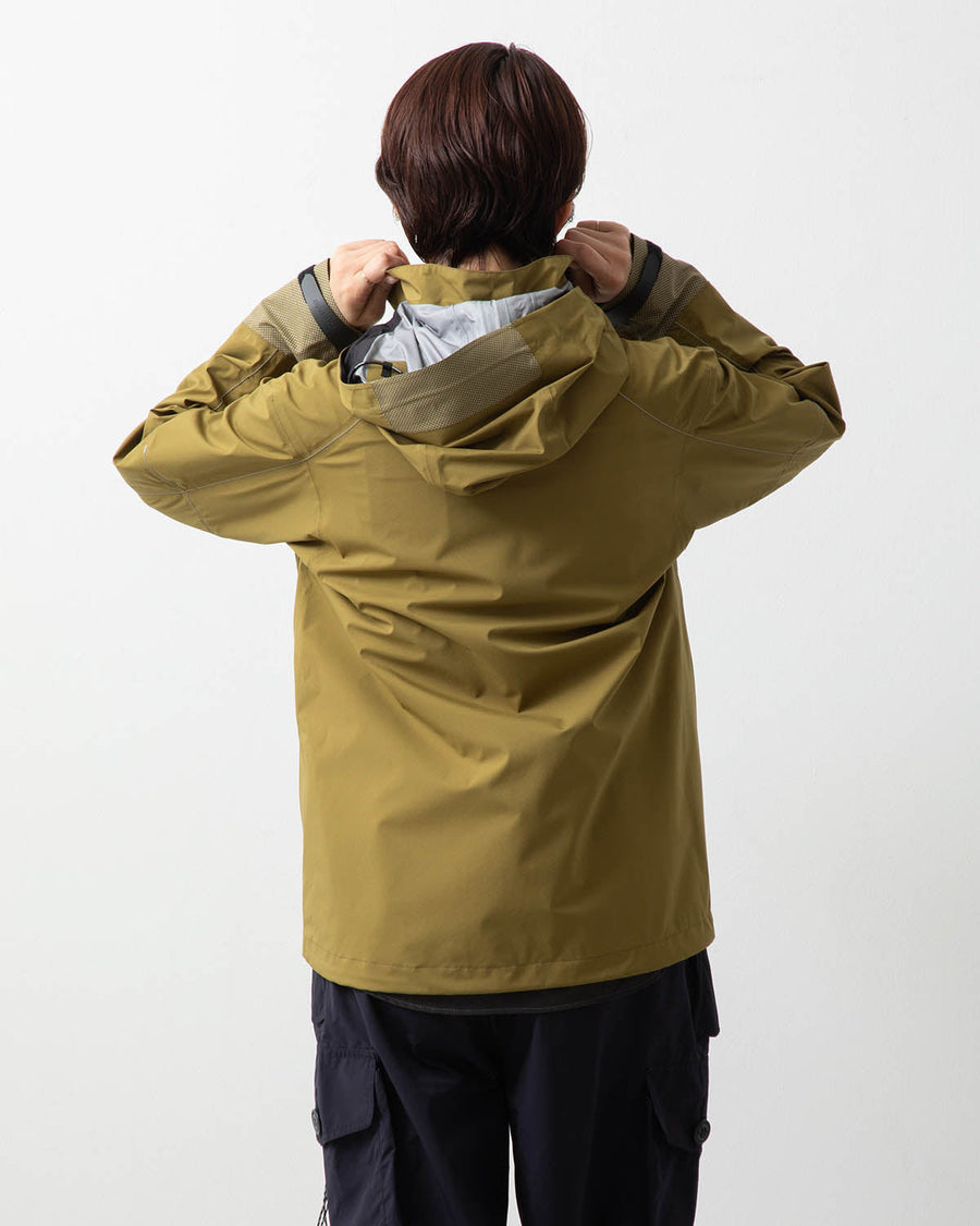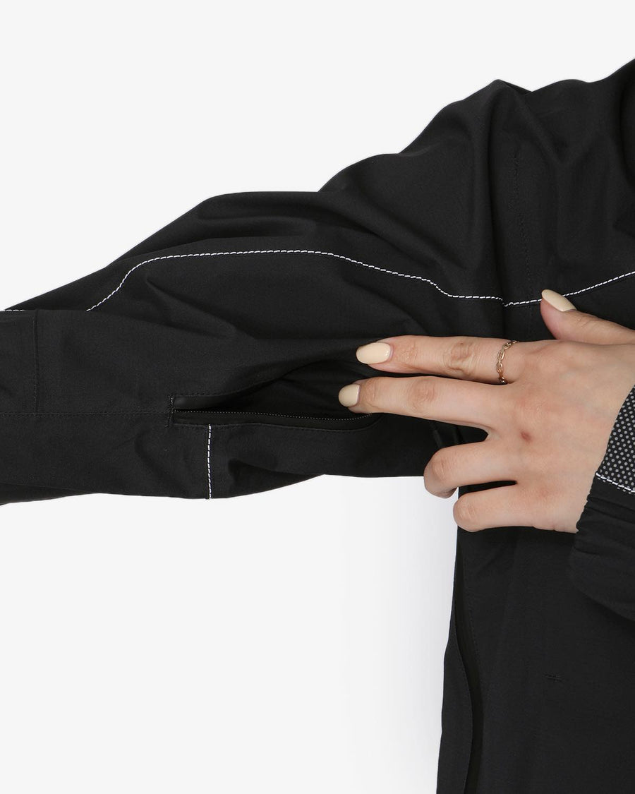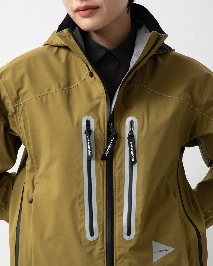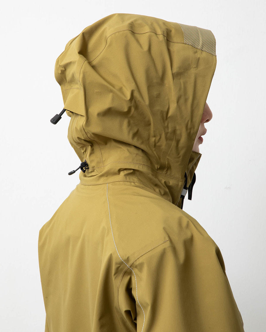 A 3-layer waterproof jacket with 40D nylon, PU film, ergonomic cut, and underarm vents.