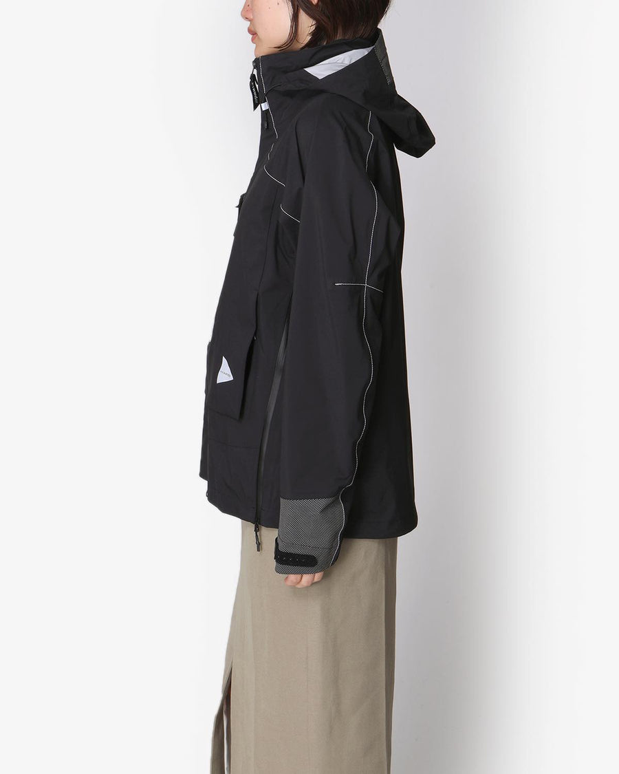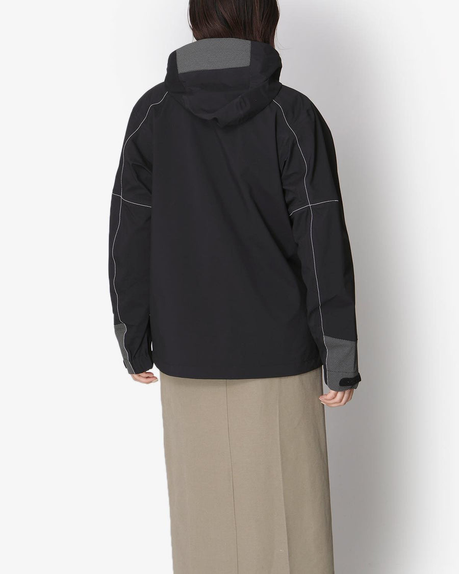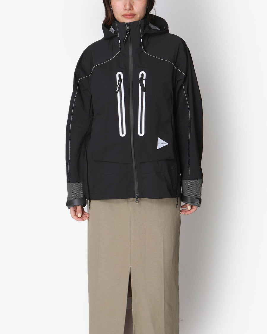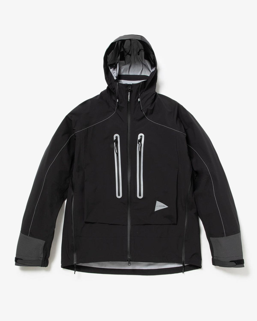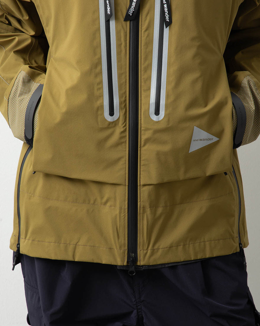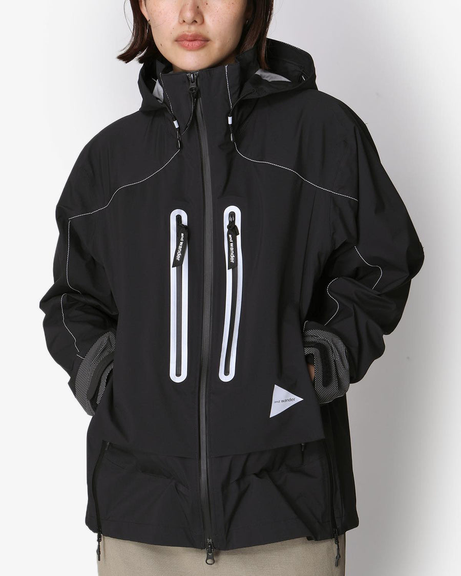 A 3-layer waterproof jacket with 40D nylon, PU film, ergonomic cut, and underarm vents.