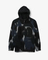 This hybrid 5G double jacquard knit hoodie blends acrylic, nylon, wool, and mohair, featuring a brushed double-sided finish and original camouflage pattern.