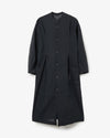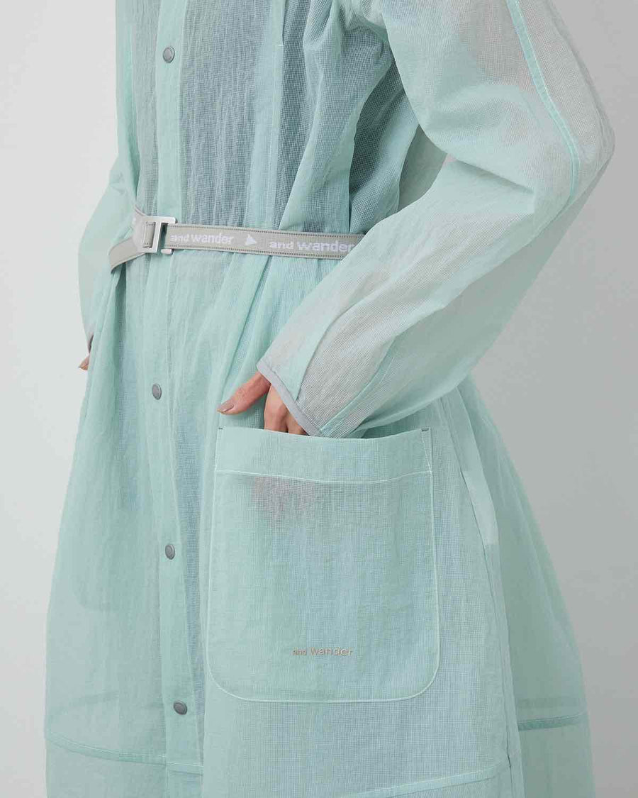 Shirt dress in sheer ripstop nylon with 3D sleeves and a removable belt for a lightweight look.