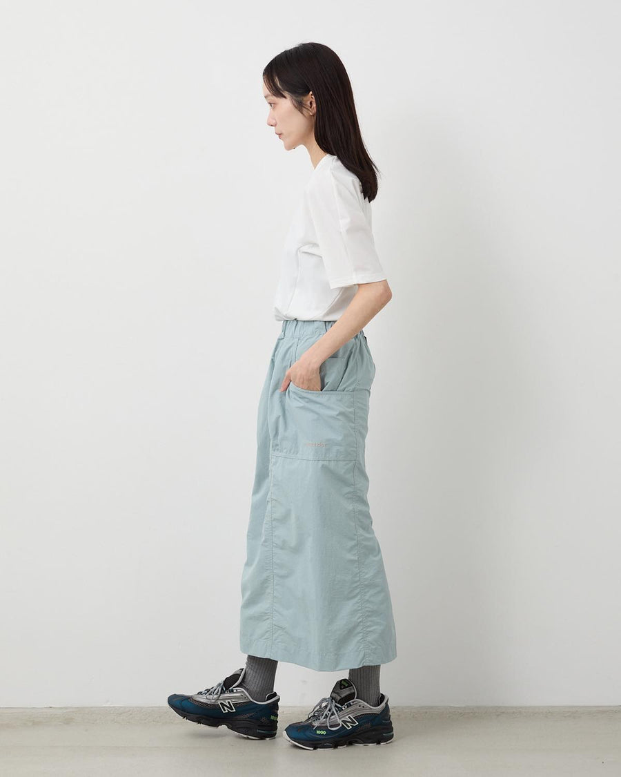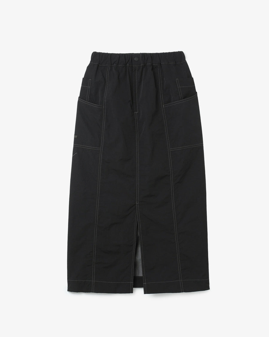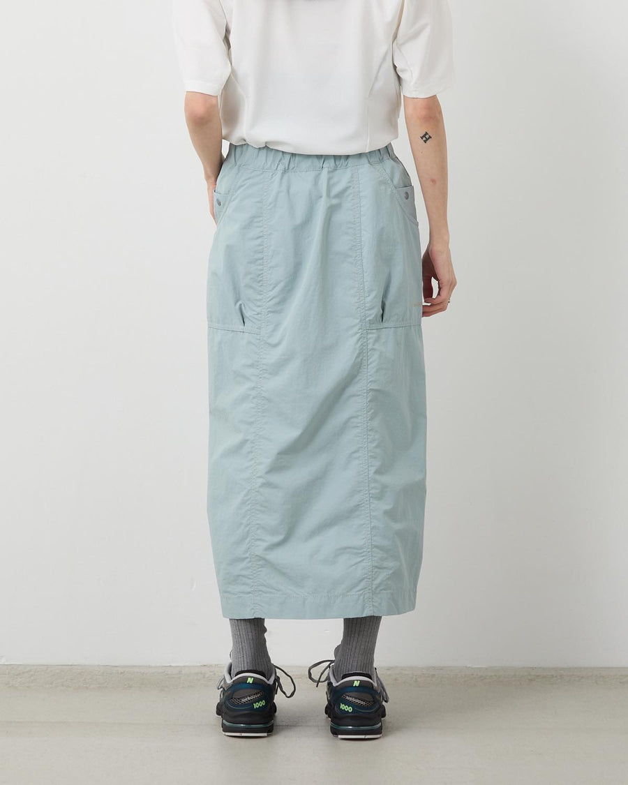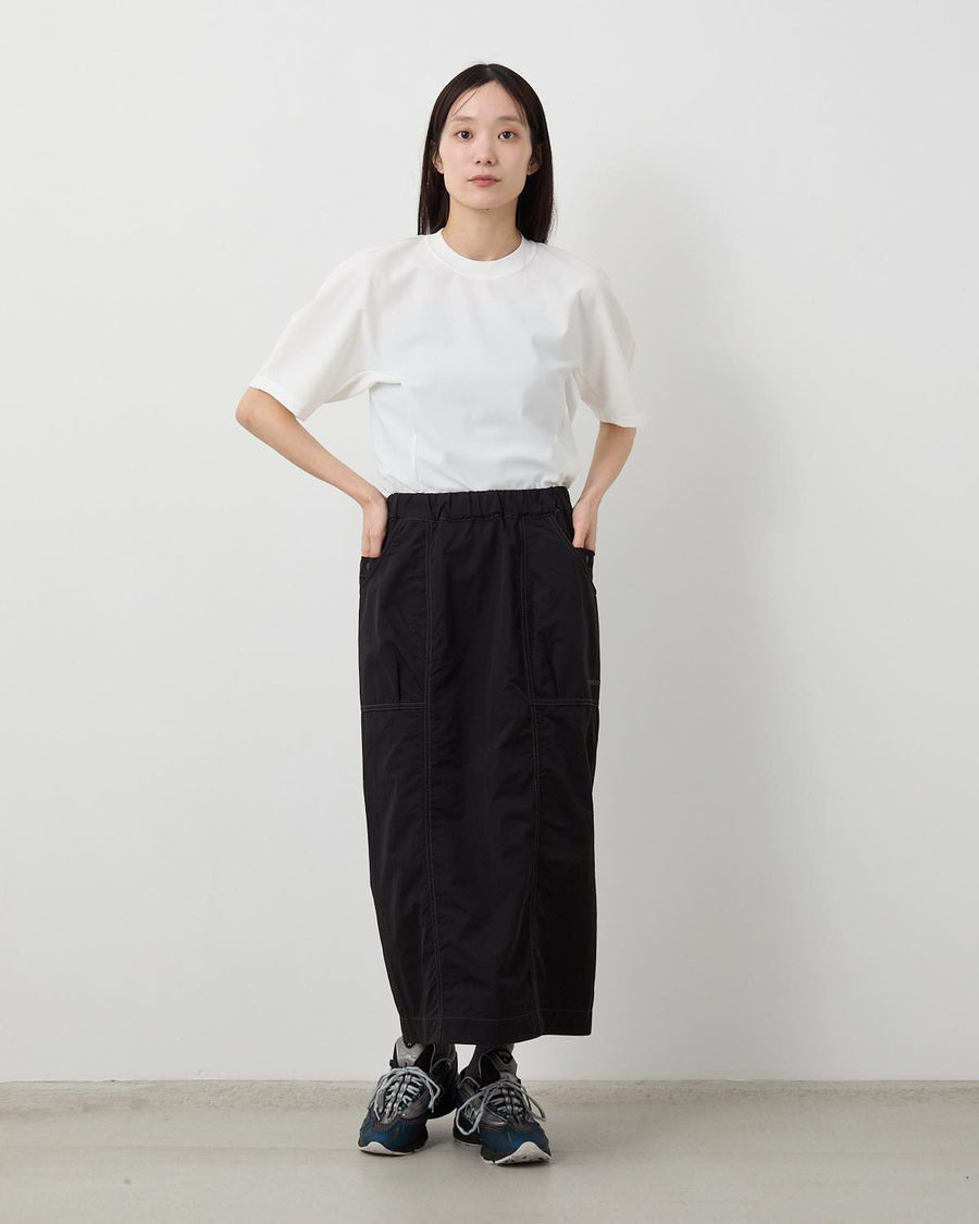 A tiered skirt in lightweight, water-repellent double-weave nylon, featuring a straight silhouette with W pockets for a sleek, stylish look.