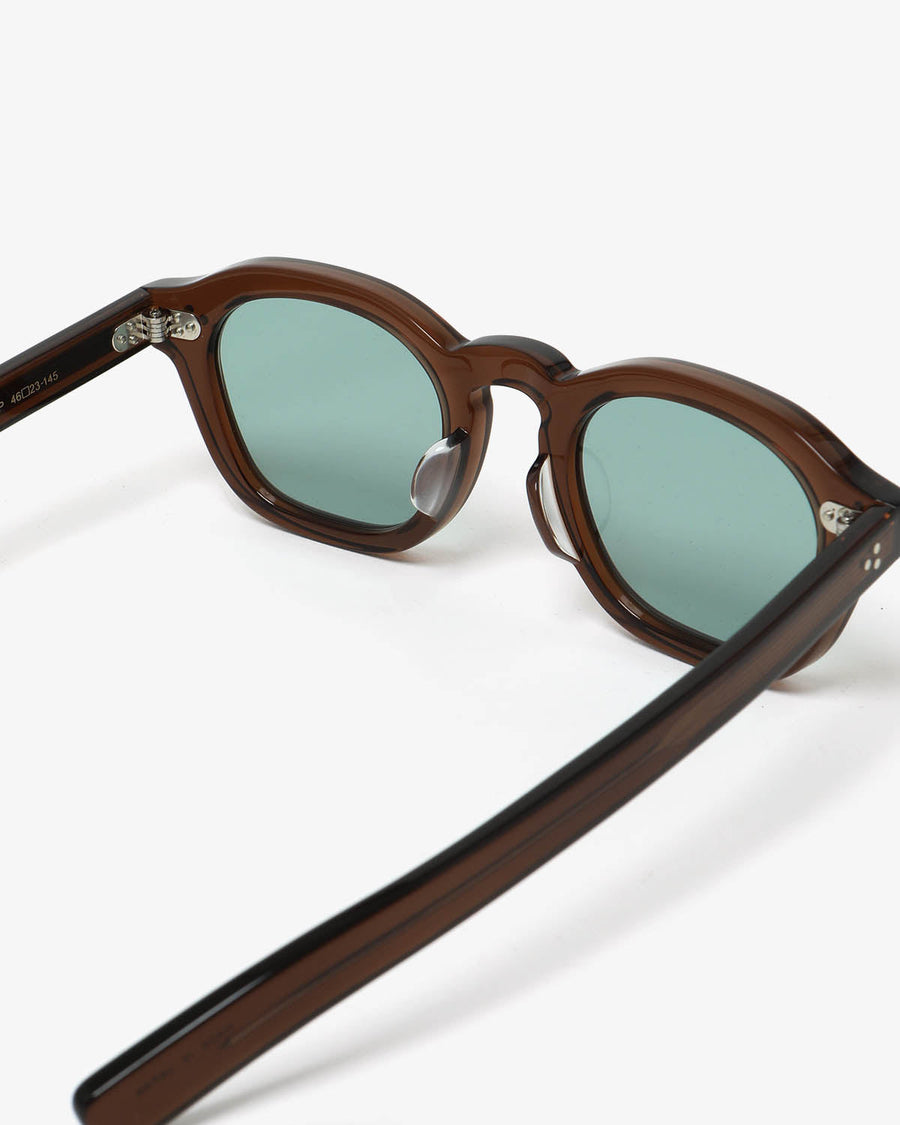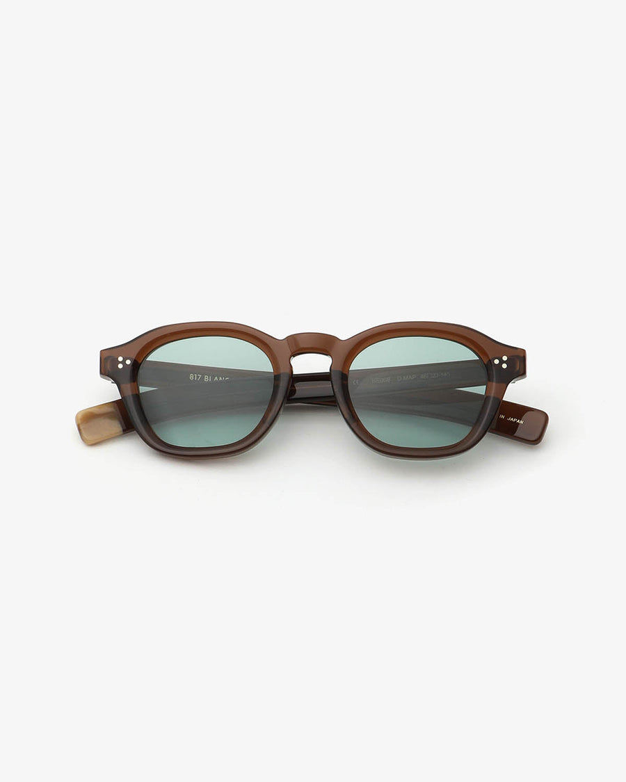 The BE008 sunglasses have bold French vintage–inspired frames and simple temples, handcrafted in Sabae, Fukui.