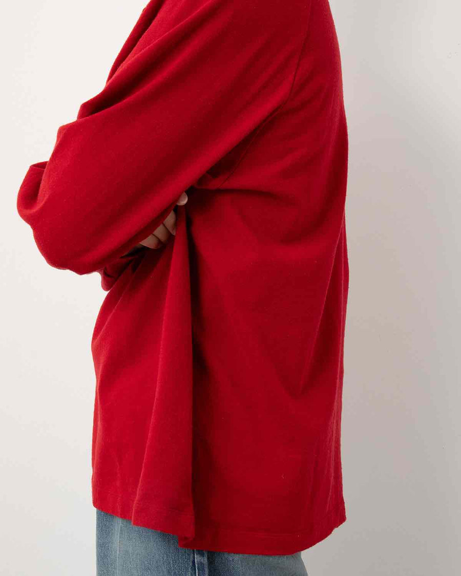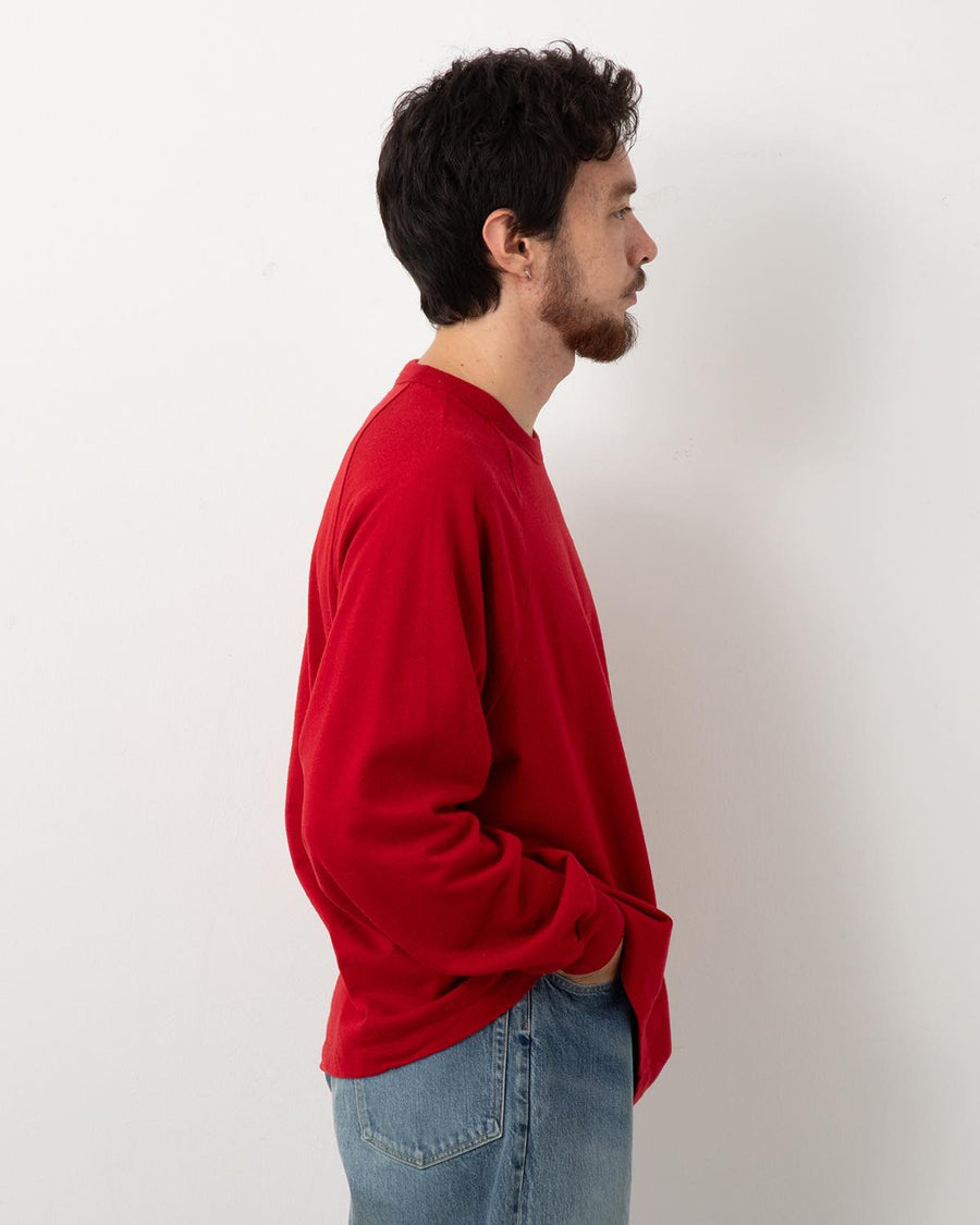 A raglan-sleeve cut-and-sew top made from raw silk backed with cotton, reducing silk’s natural drape while retaining its smooth texture. The intentional dye irregularities create a distinctive finish.