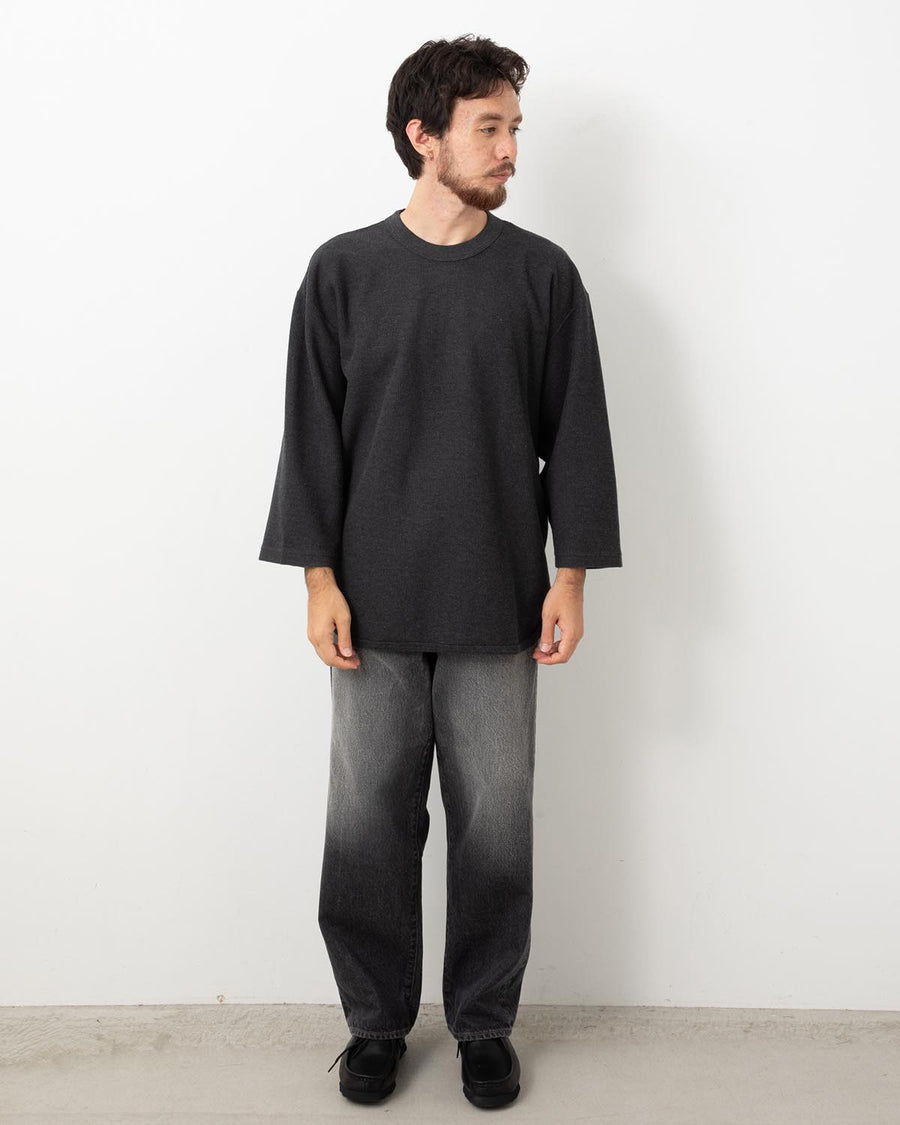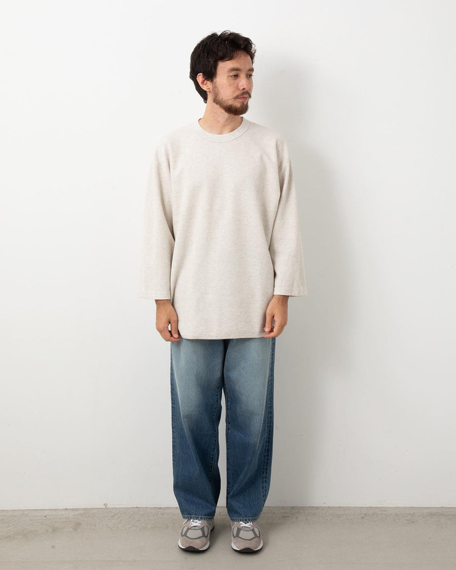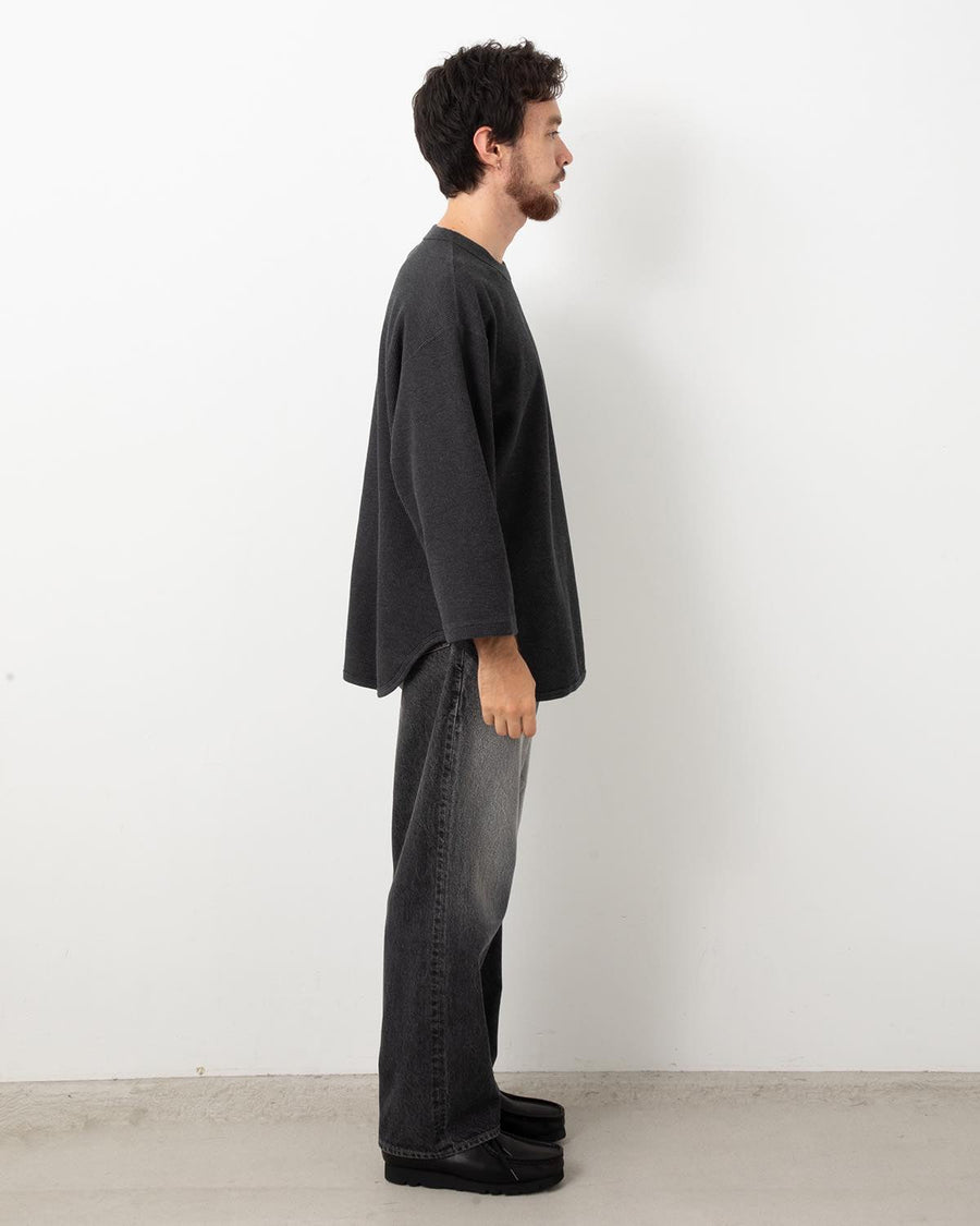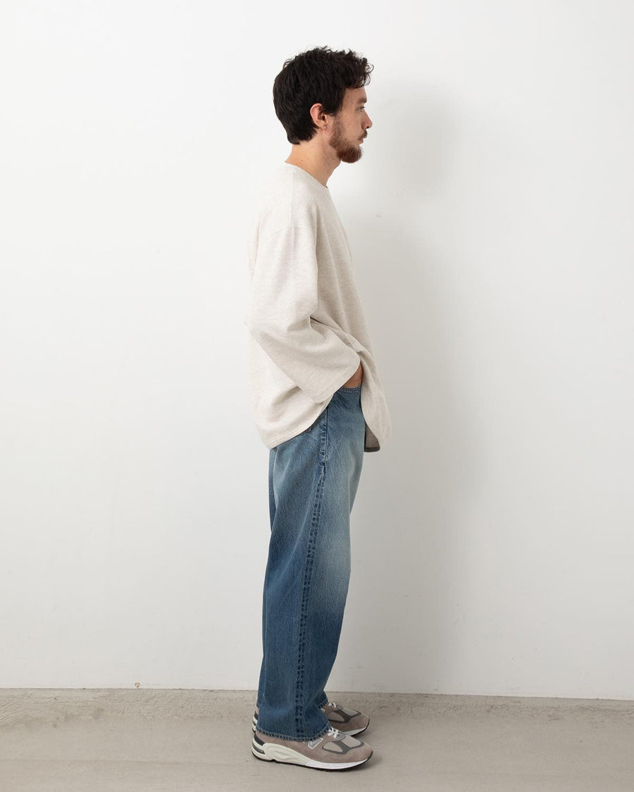 Trousers in 13.5oz denim designed for natural slubs, slight nap, and subtle fading. Featuring a comfortable wide-straight silhouette with added room at the hips and thighs.