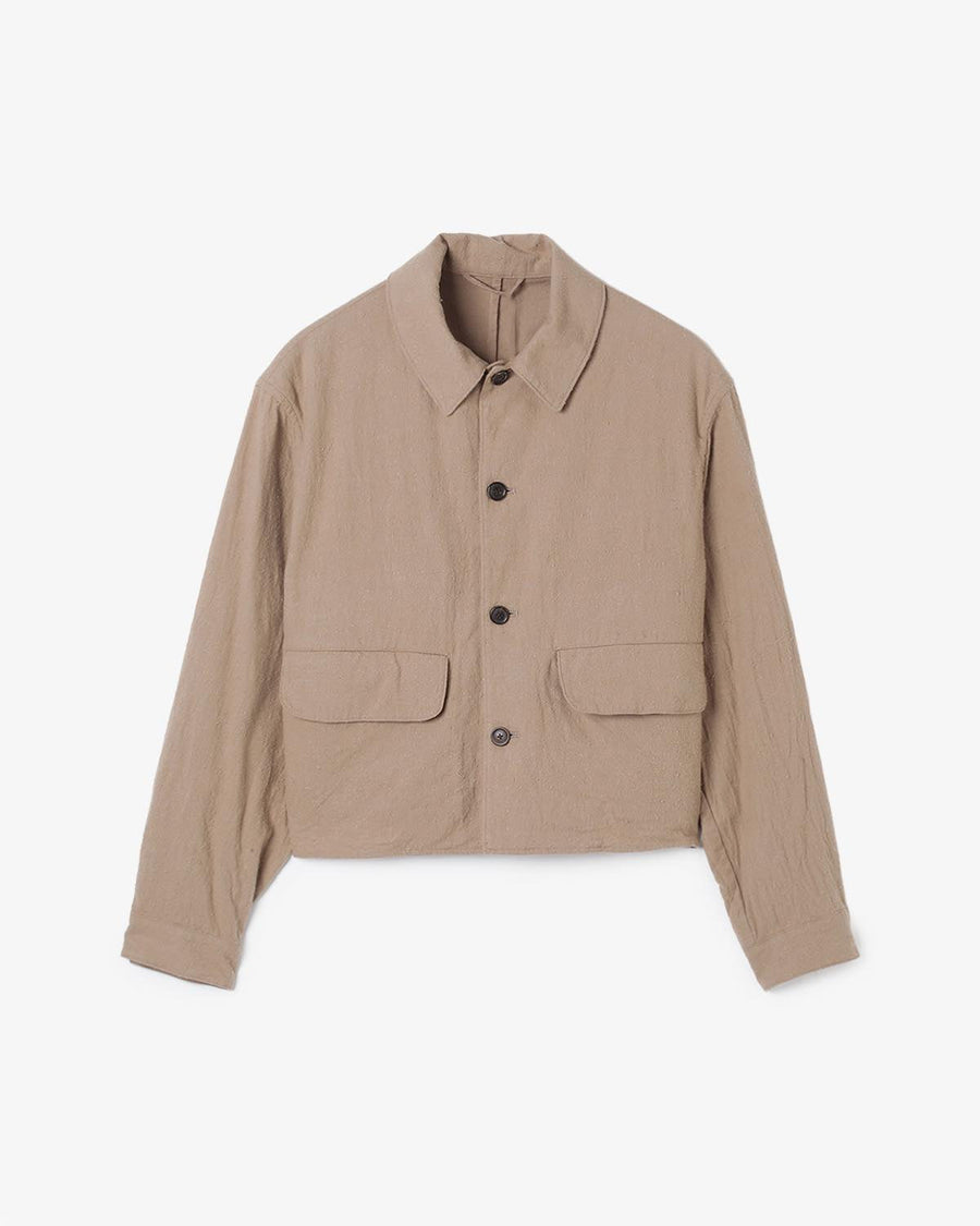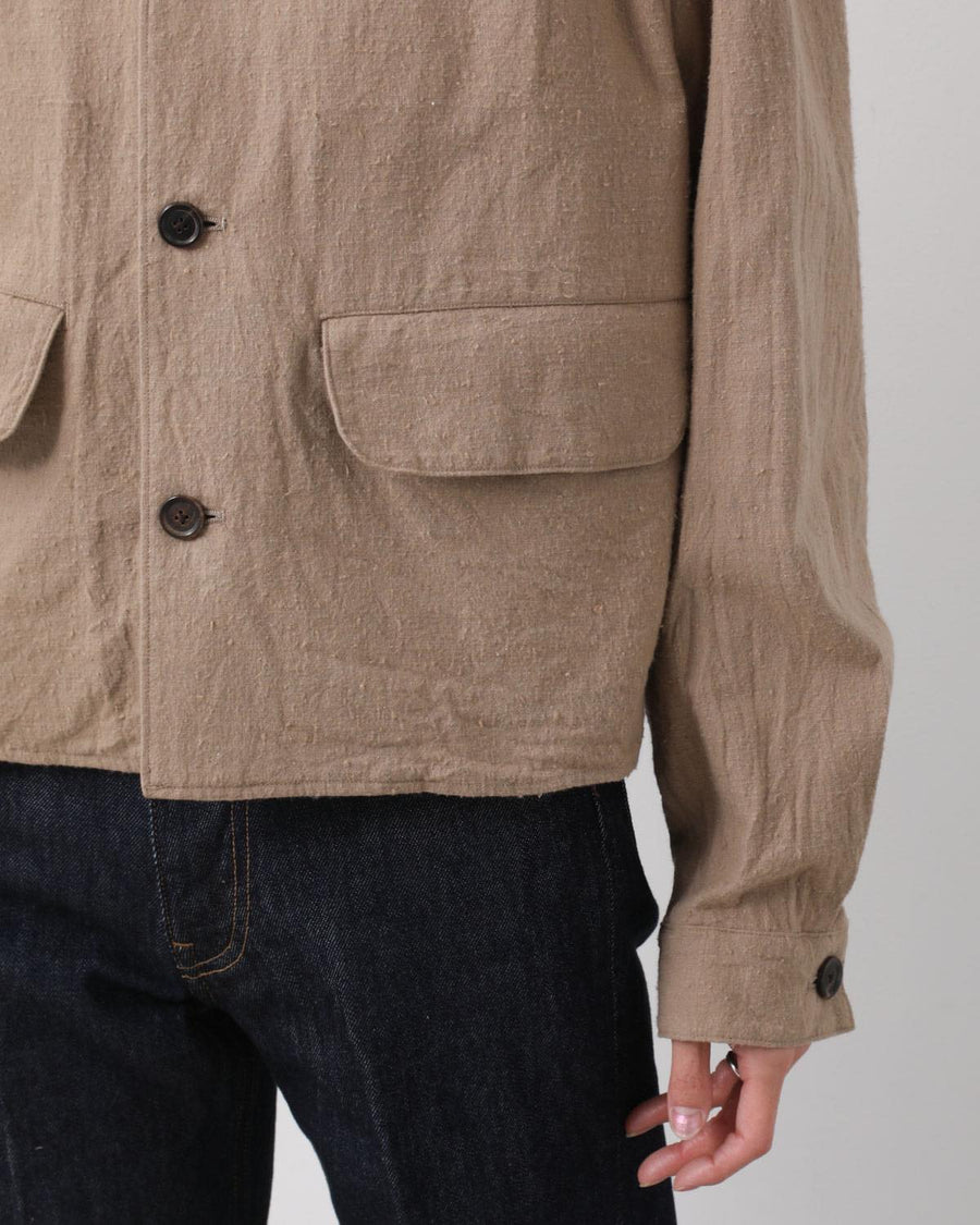 This jacket is made from yarn-dyed cotton blended with silk nep, woven with three uneven yarns.