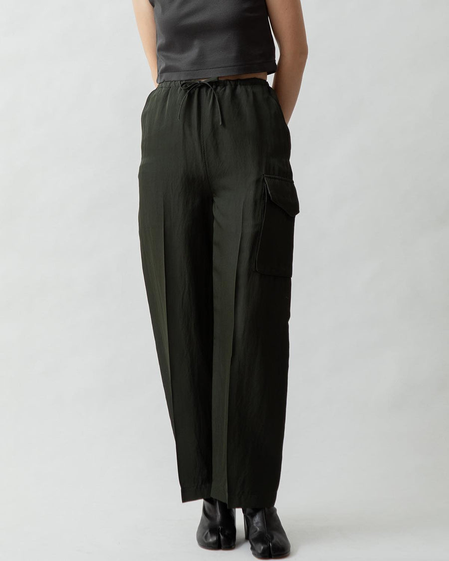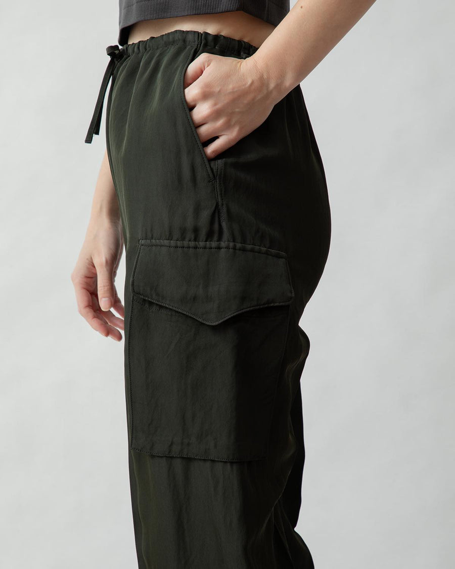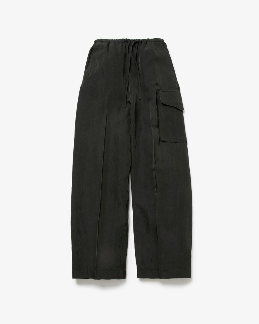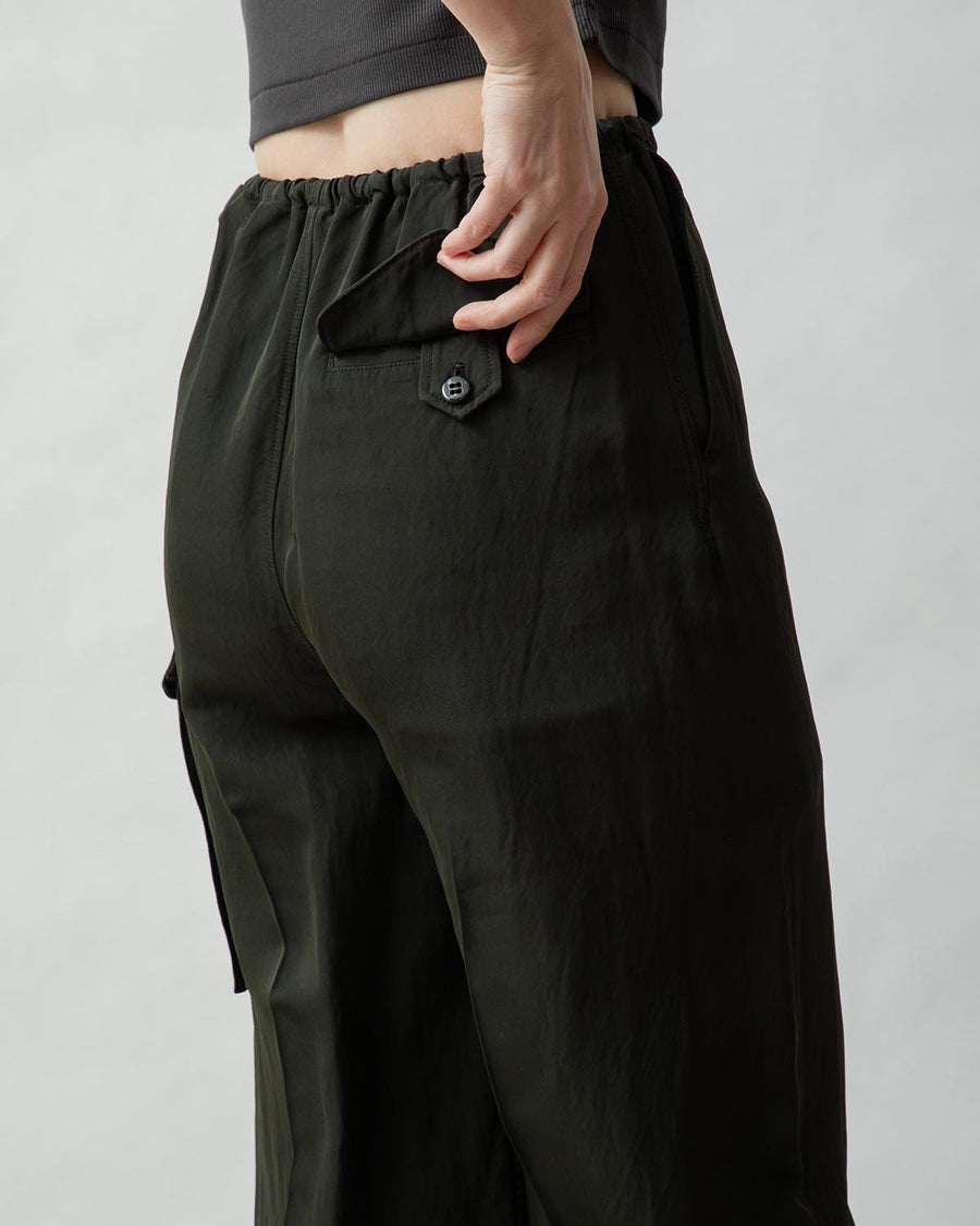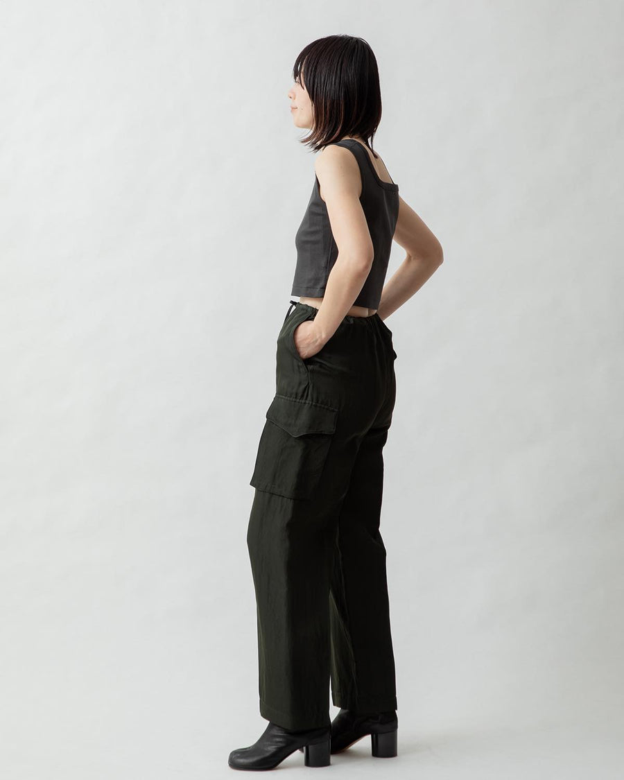 Cargo pants made from a rayon, nylon, and silk blend with a textured twill pattern and vintage details.
