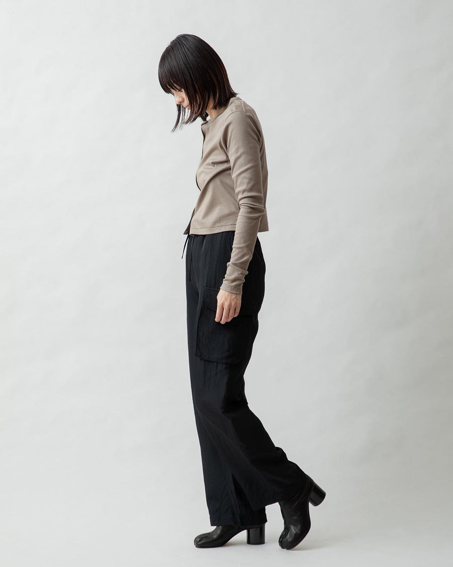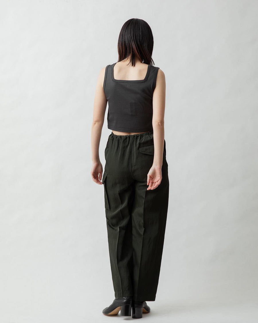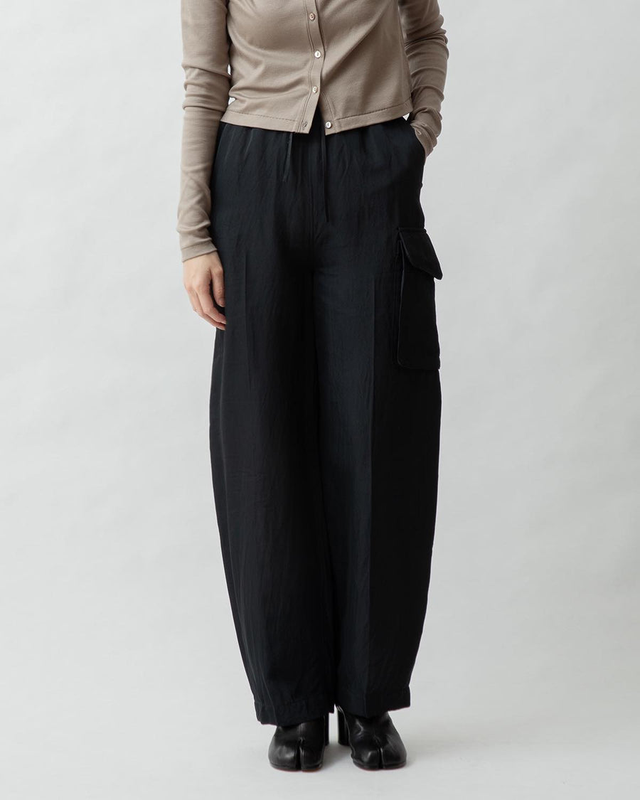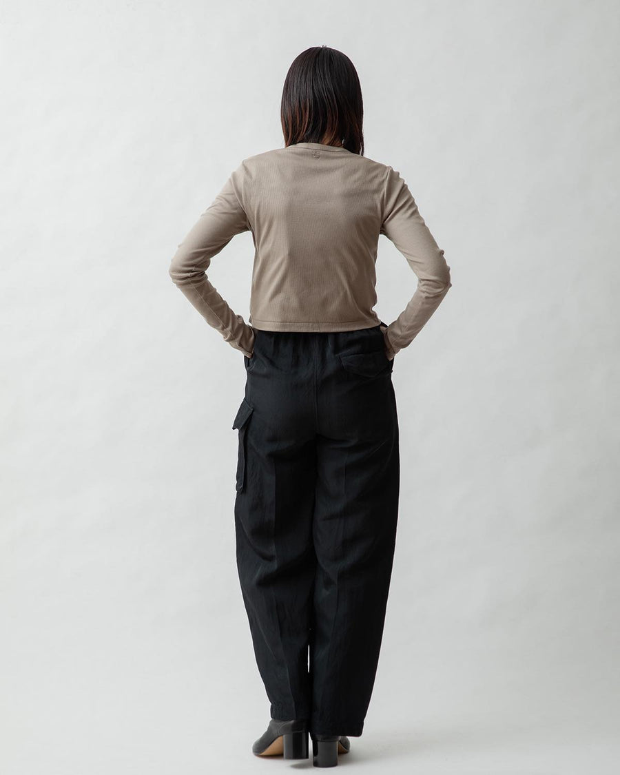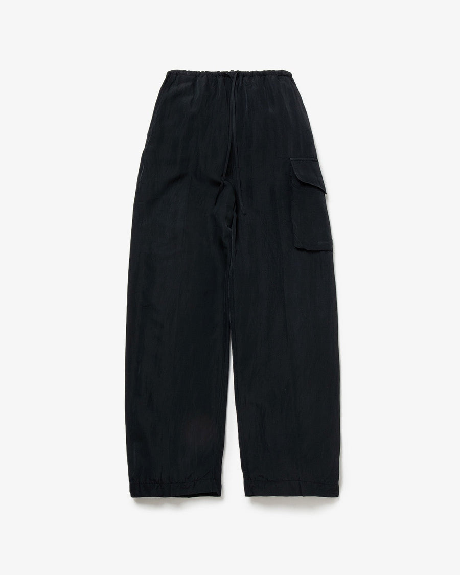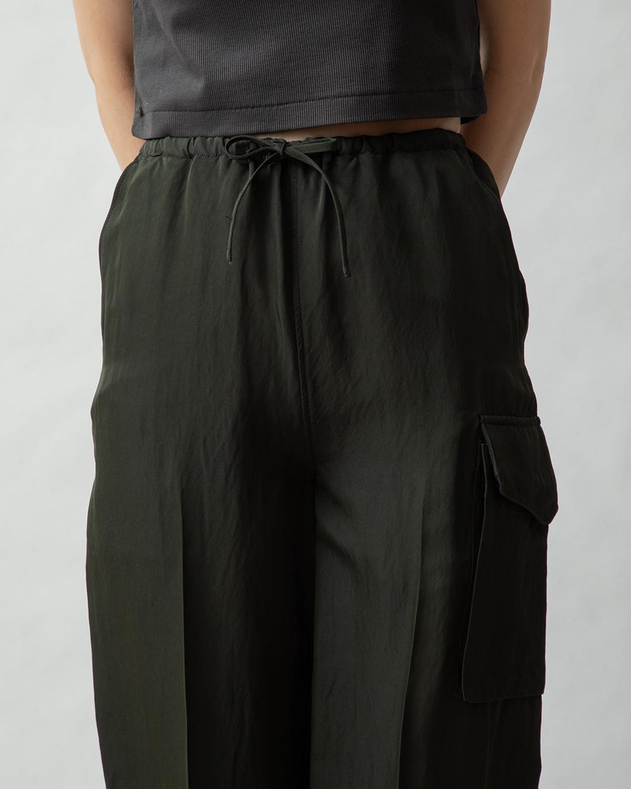 Cargo pants made from a rayon, nylon, and silk blend with a textured twill pattern and vintage details.