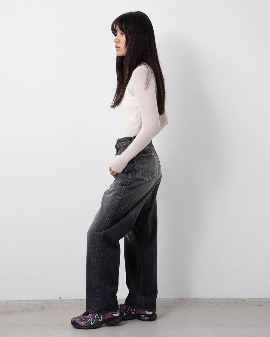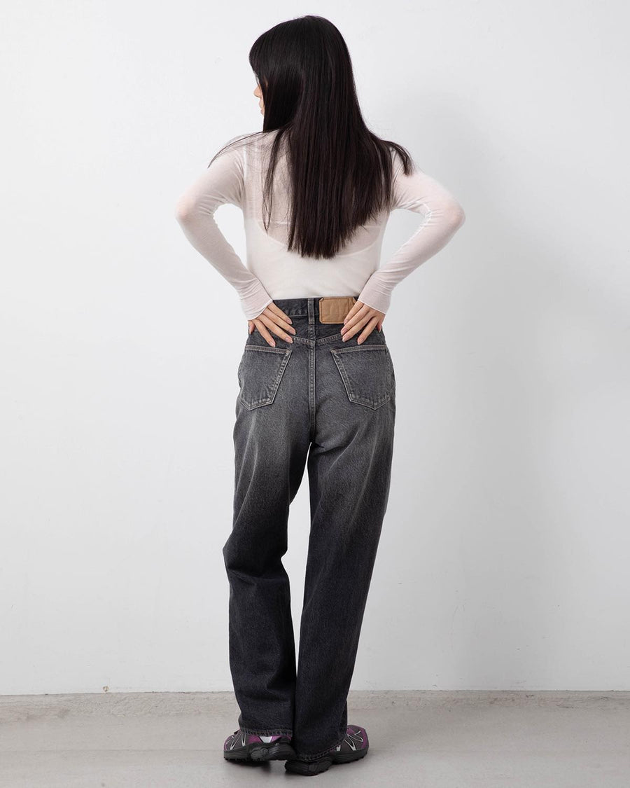 13.5oz denim trousers with natural texture, subtle fuzz, and a slim straight fit.