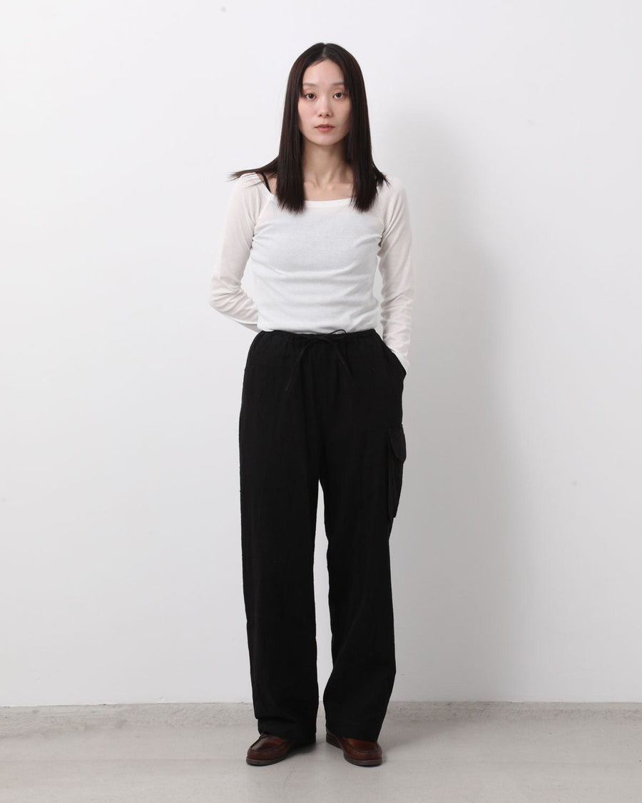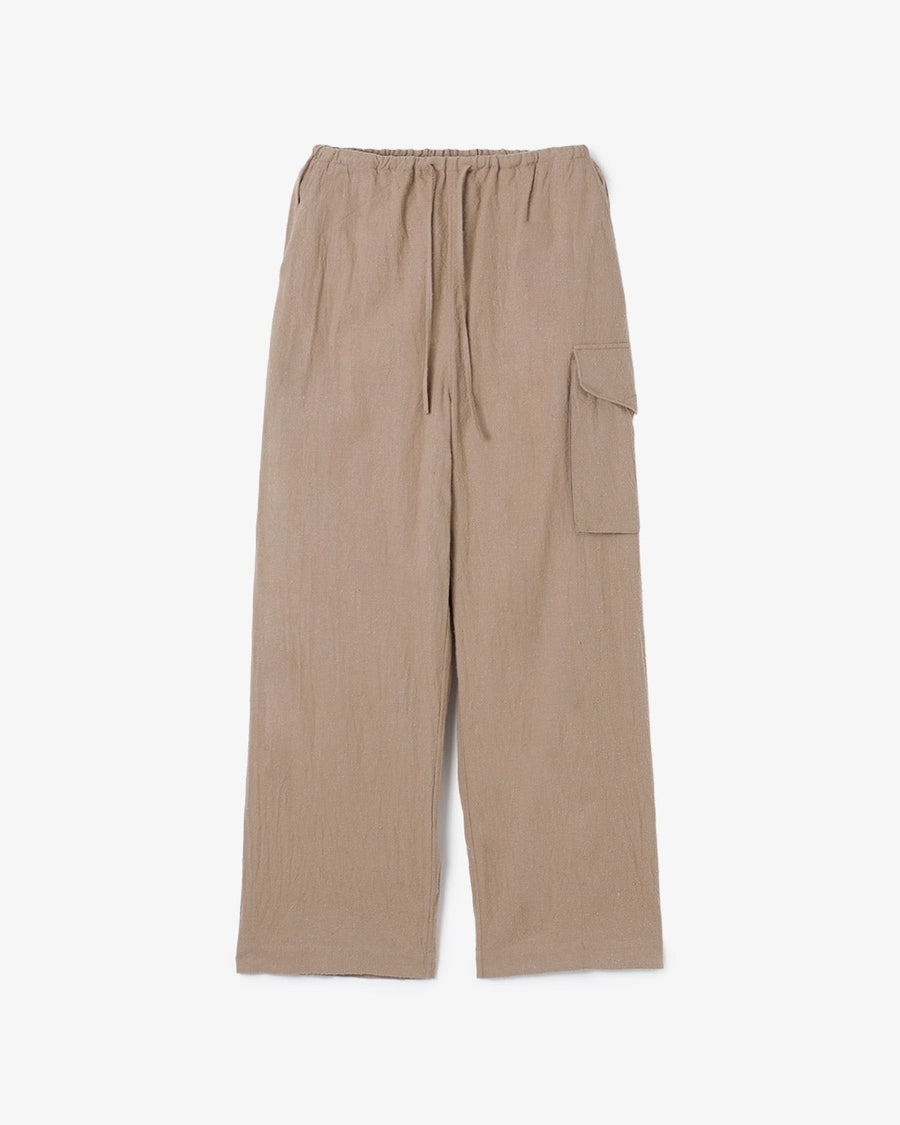 These trousers are made from yarn-dyed cotton blended with silk nep, woven with three uneven yarns.