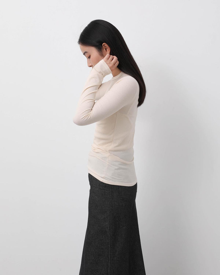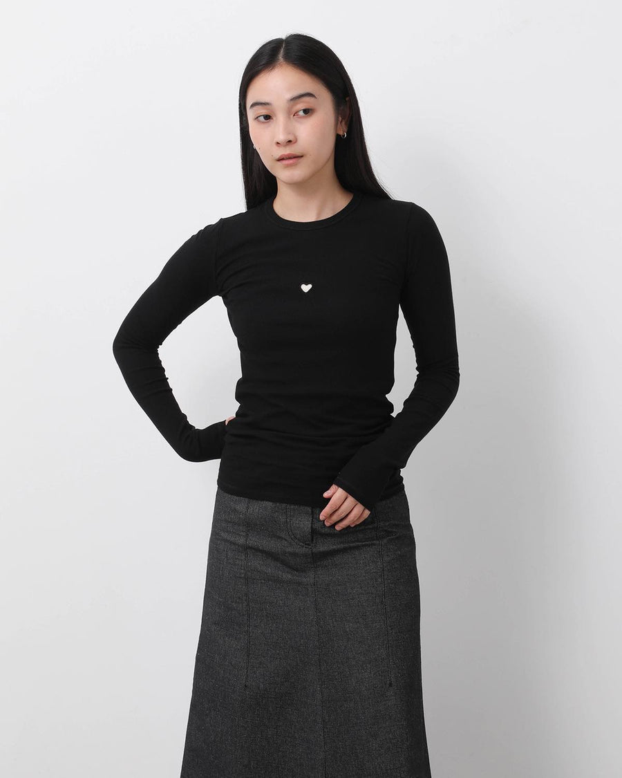 A long-sleeve T-shirt crafted from organic cotton rib fabric. It features a playful heart-shaped cut-out on the front.