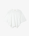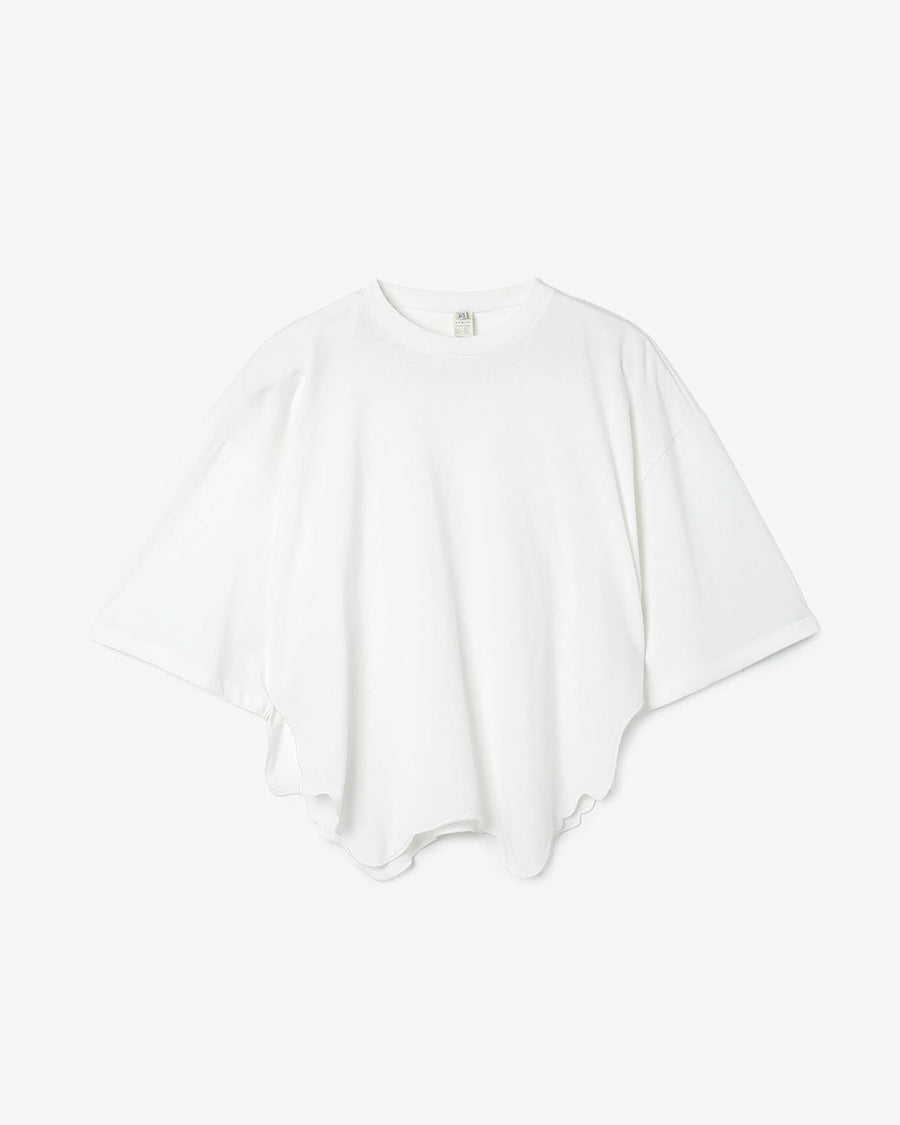 リジェネラティブ・コットン(土壌の再生と回復を目的とした、化学肥料や農薬の使用を最小限に抑える環境再生型農業によって生産されたコットン。)を使用したクルーネックTシャツです。 ランダムにカットアウトされたような、裾のデザインが特徴です。