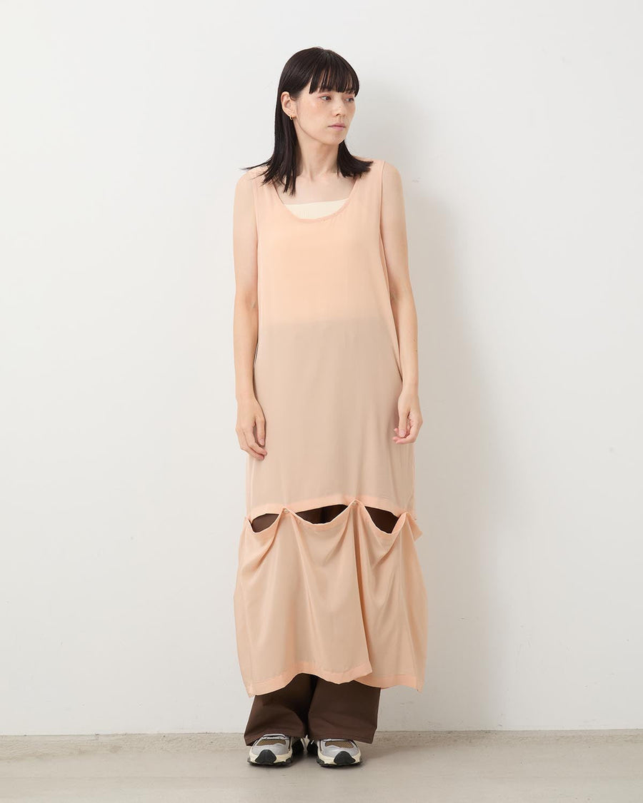 A glossy silk crepe dress with a buttoned, removable hem detail.