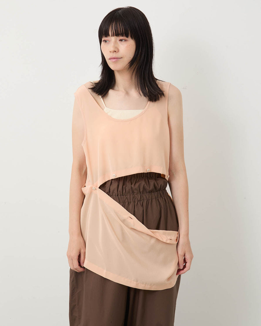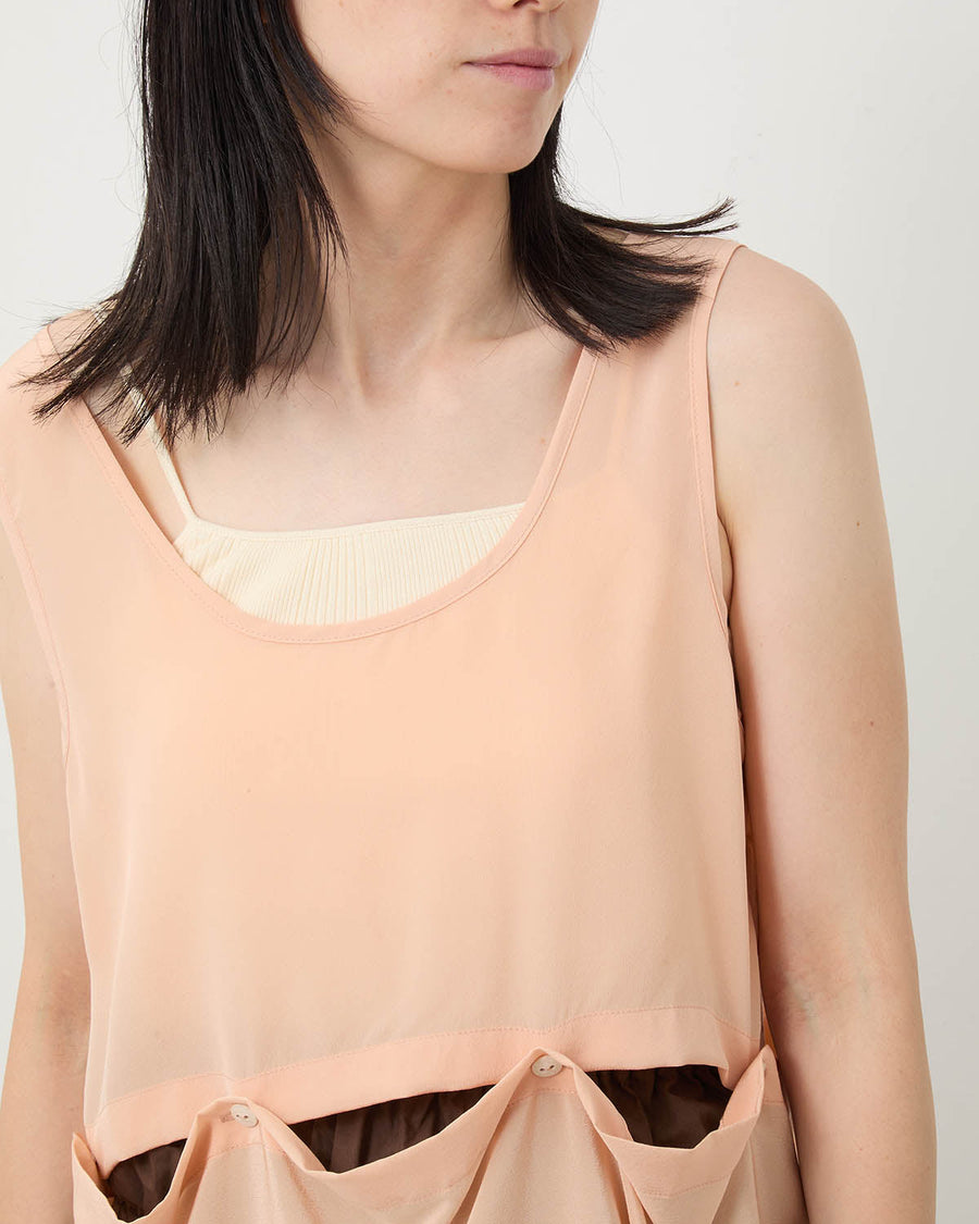 A glossy silk crepe tank top with a removable buttoned waist detail.