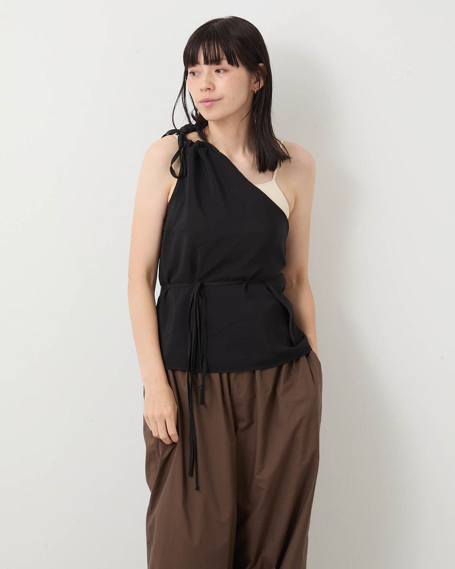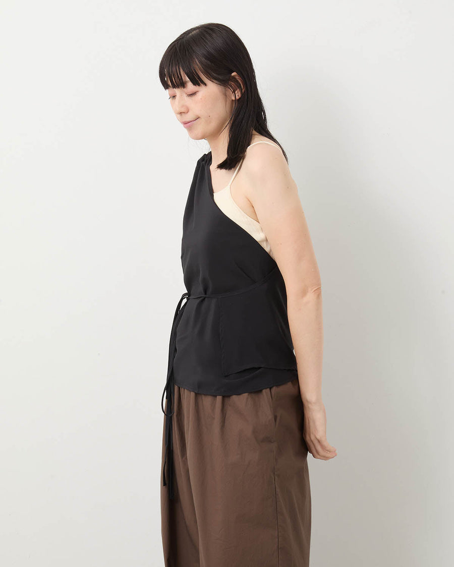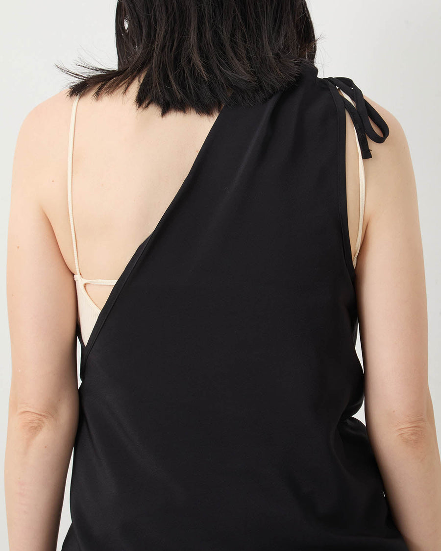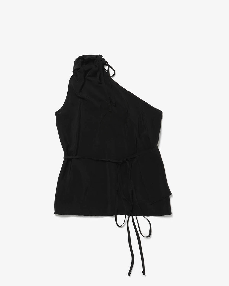 An asymmetric wrap top made from structured 100% wild silk, featuring ties at the neck and waist for adjustable silhouette.