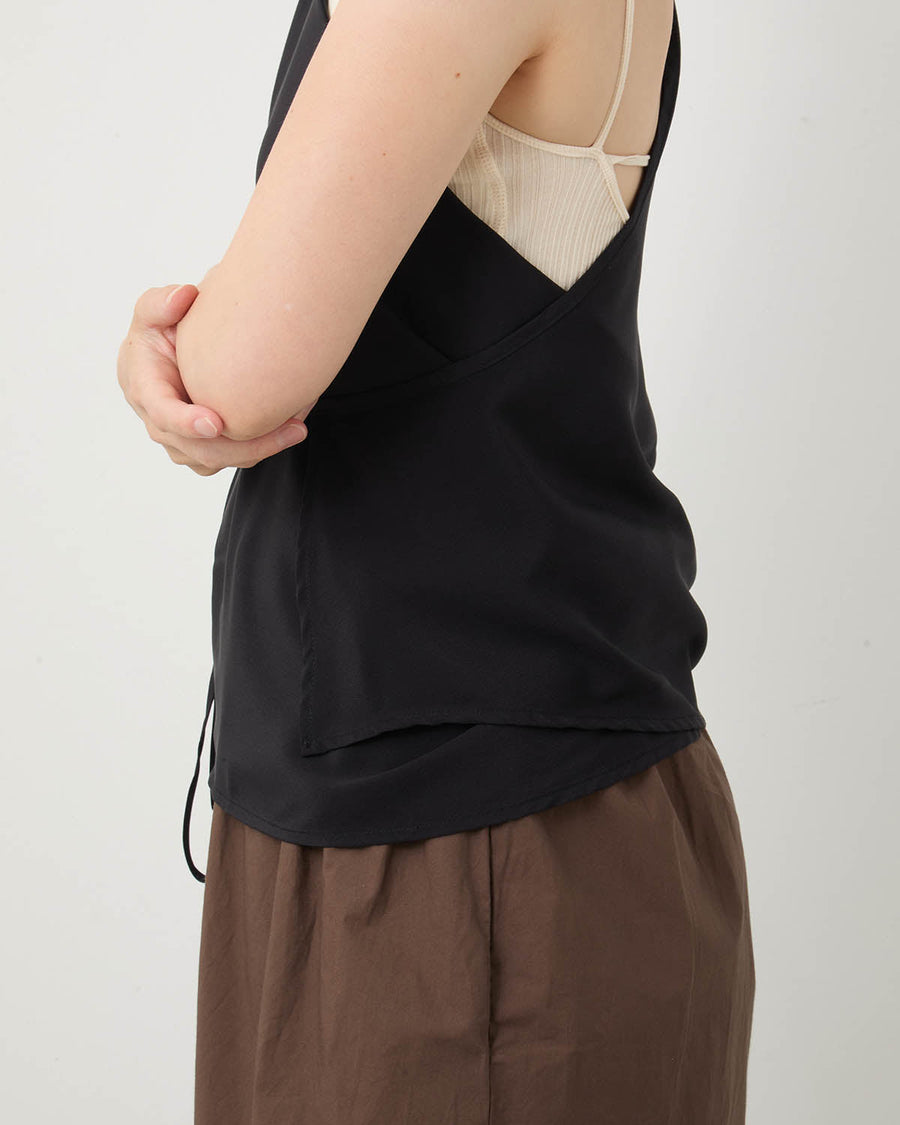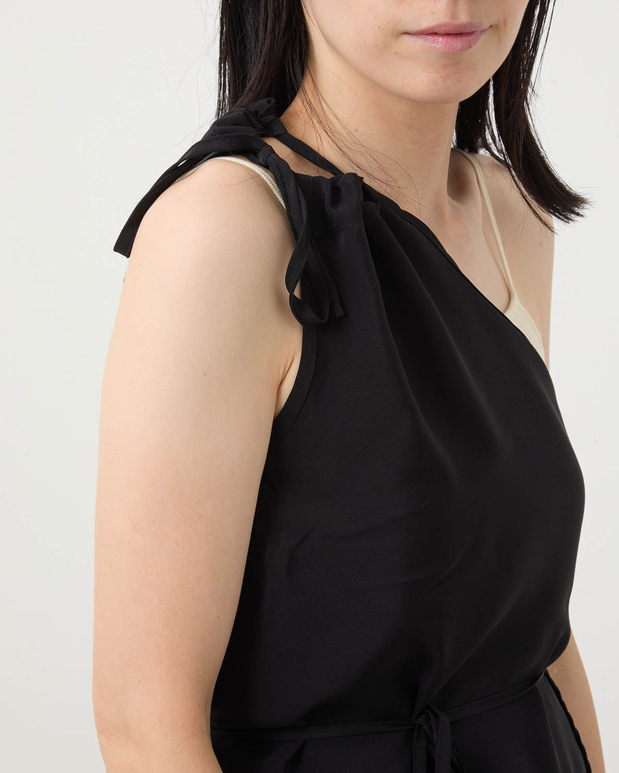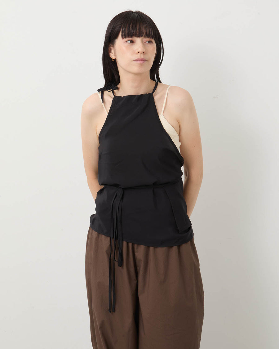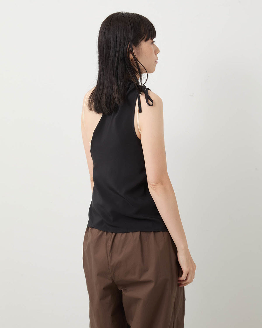 An asymmetric wrap top made from structured 100% wild silk, featuring ties at the neck and waist for adjustable silhouette.