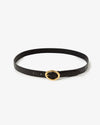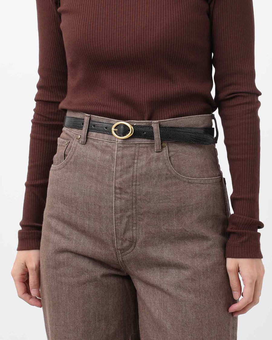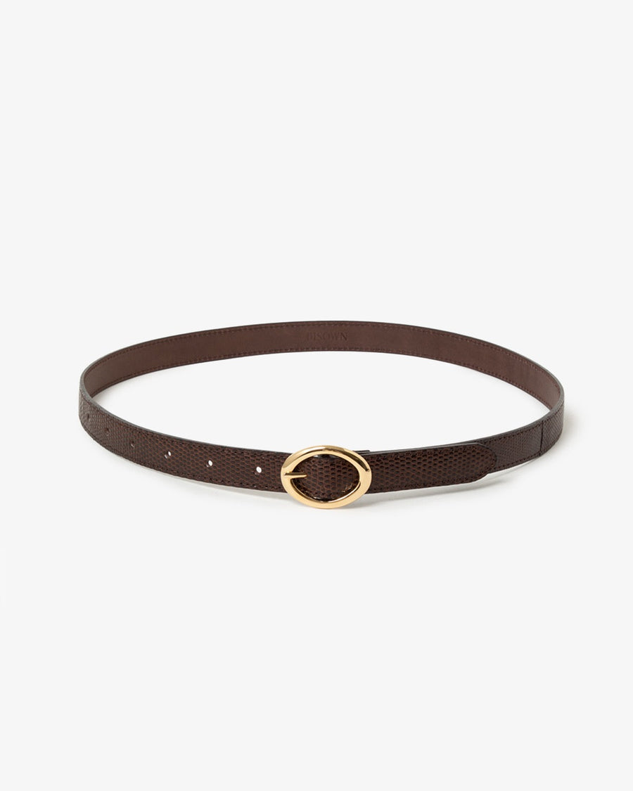 This handmade lizard leather belt features a classic gold-plated buckle and simple matching leather on the reverse.