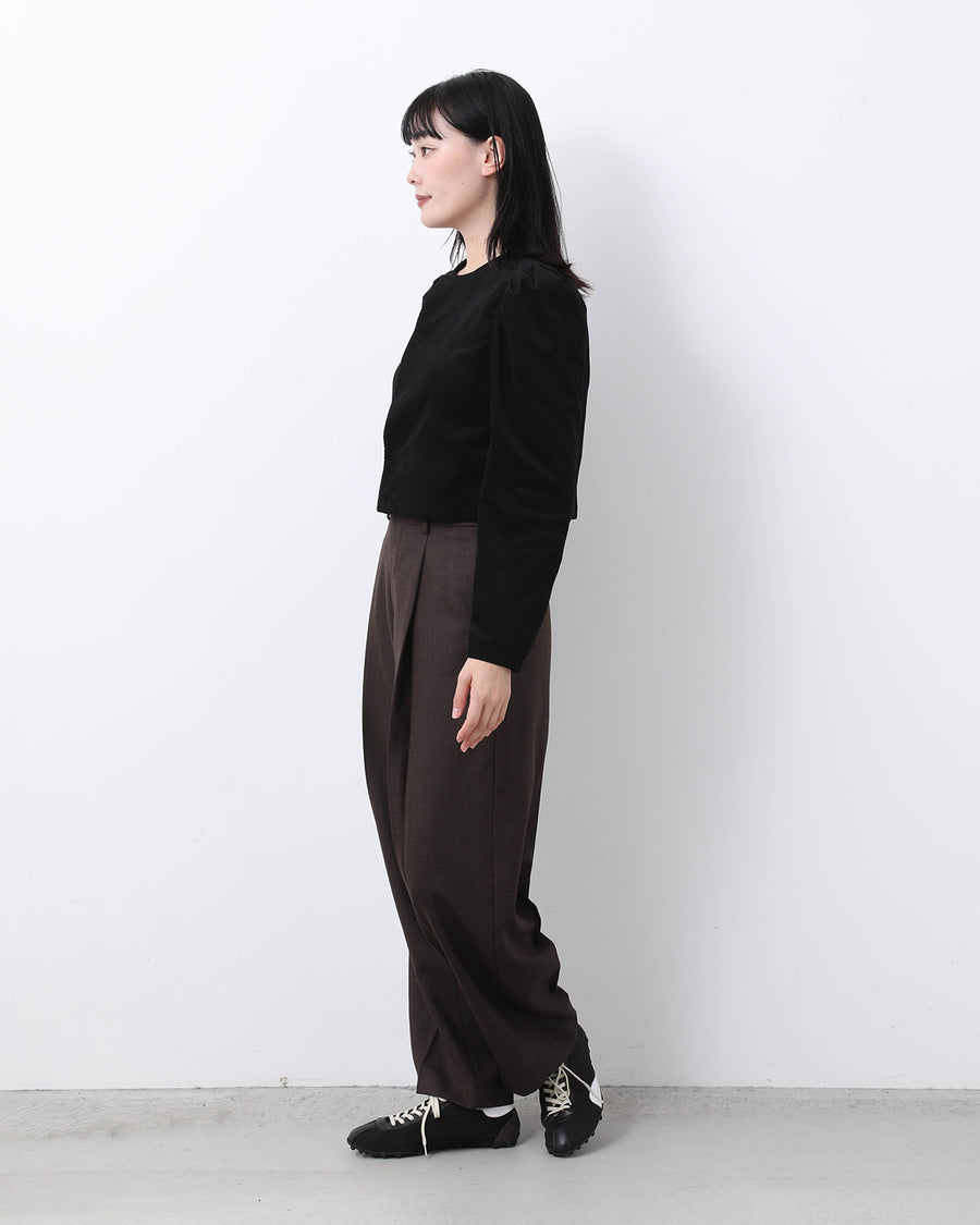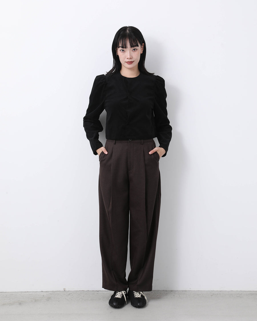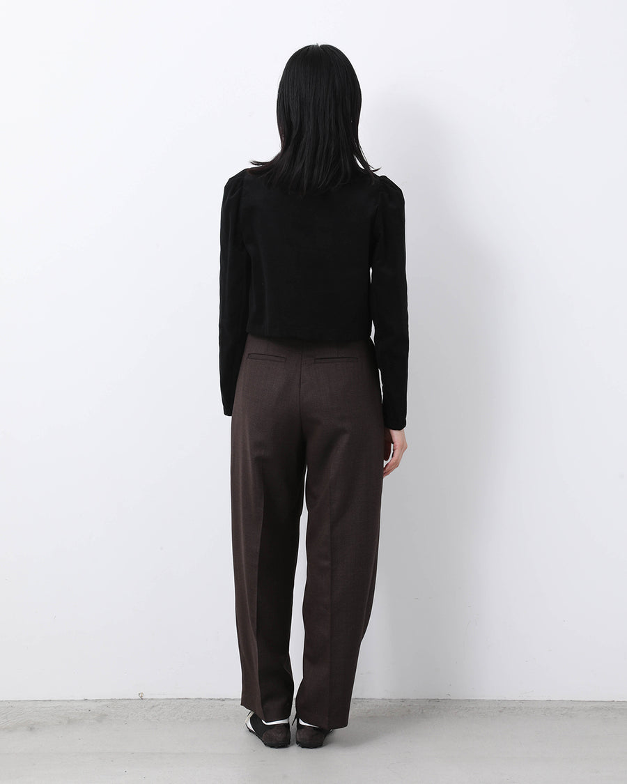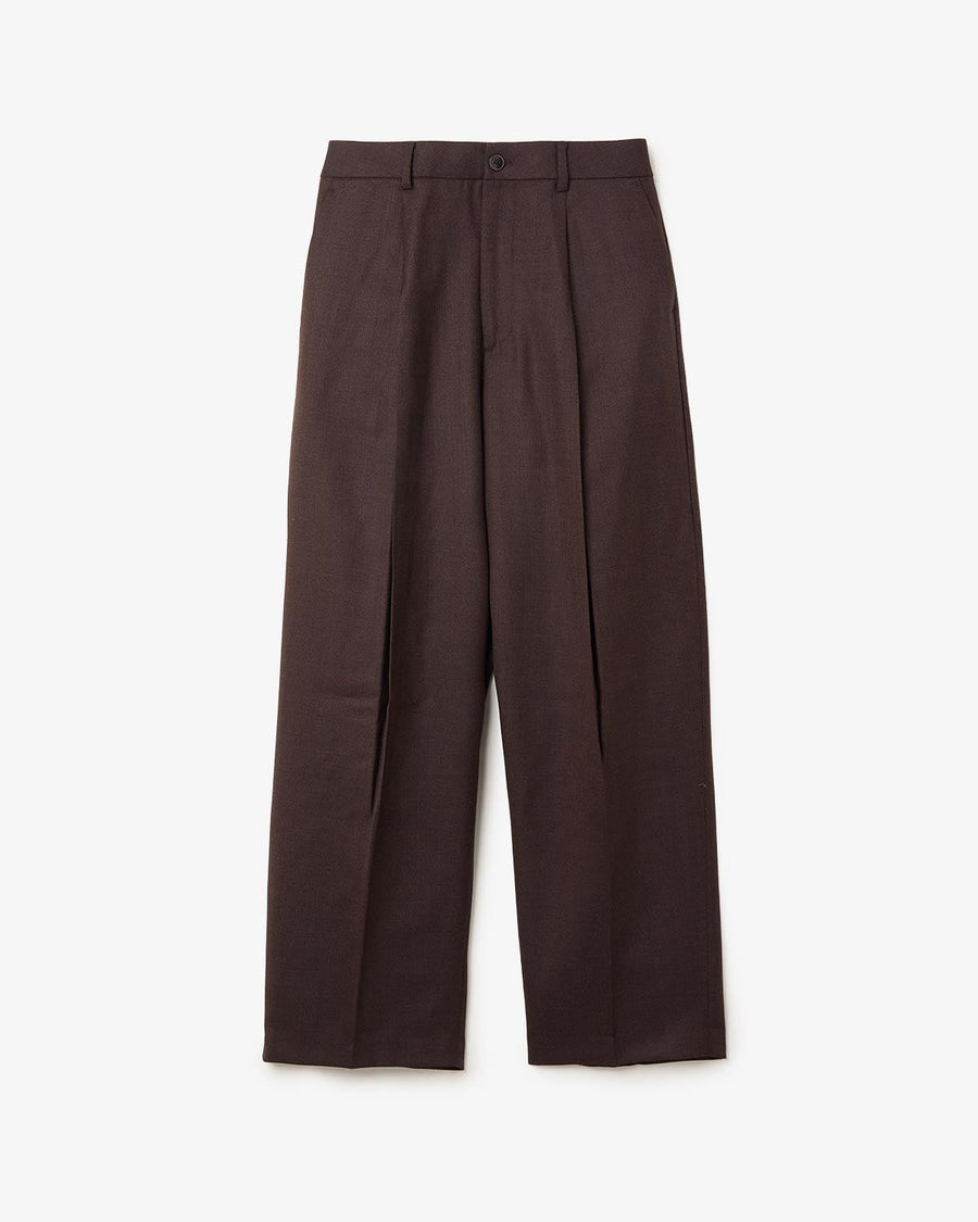 Wide trousers inspired by 1980s archives, crafted from premium Bishu wool in a classic barrathea weave. A deep front tuck creates a relaxed drape and elegant silhouette.