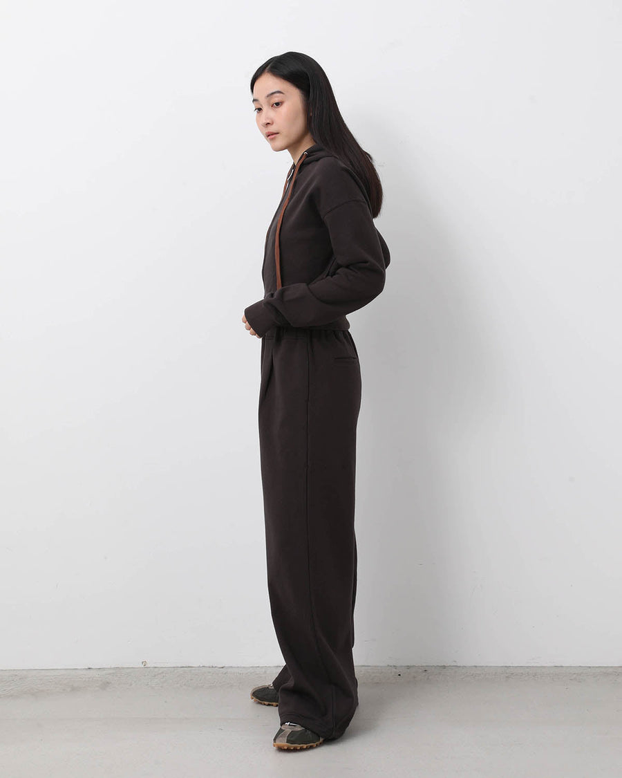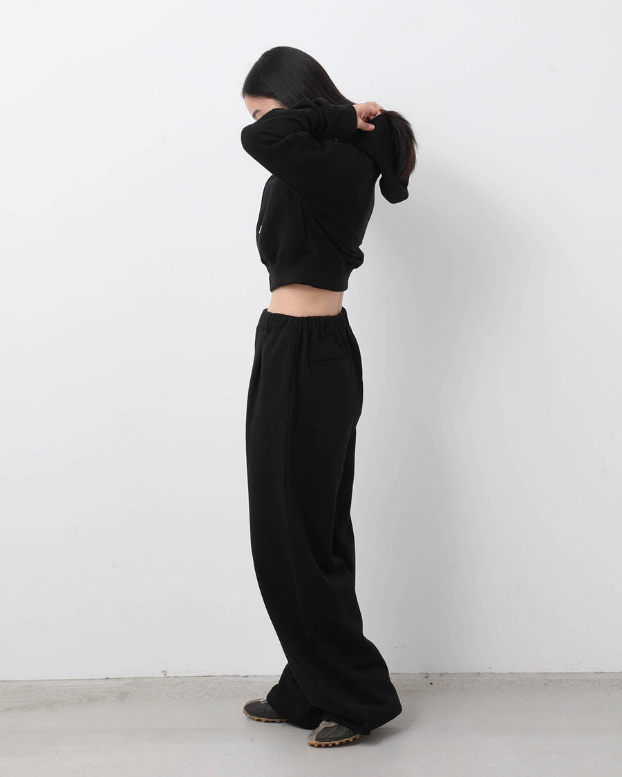 These sweatpants are made from cotton-wool fleece, offering a soft, warm feel. The draped fabric and waist tucks create a refined, slacks-like design.
