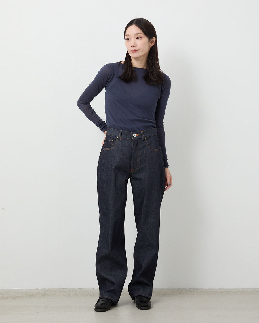 BISOWN’s signature 5-pocket denim is made from cotton denim by a manufacturer operating since the early 1900s, featuring a soft feel from loosely twisted thick yarns and a low-rise, hip-sitting fit.