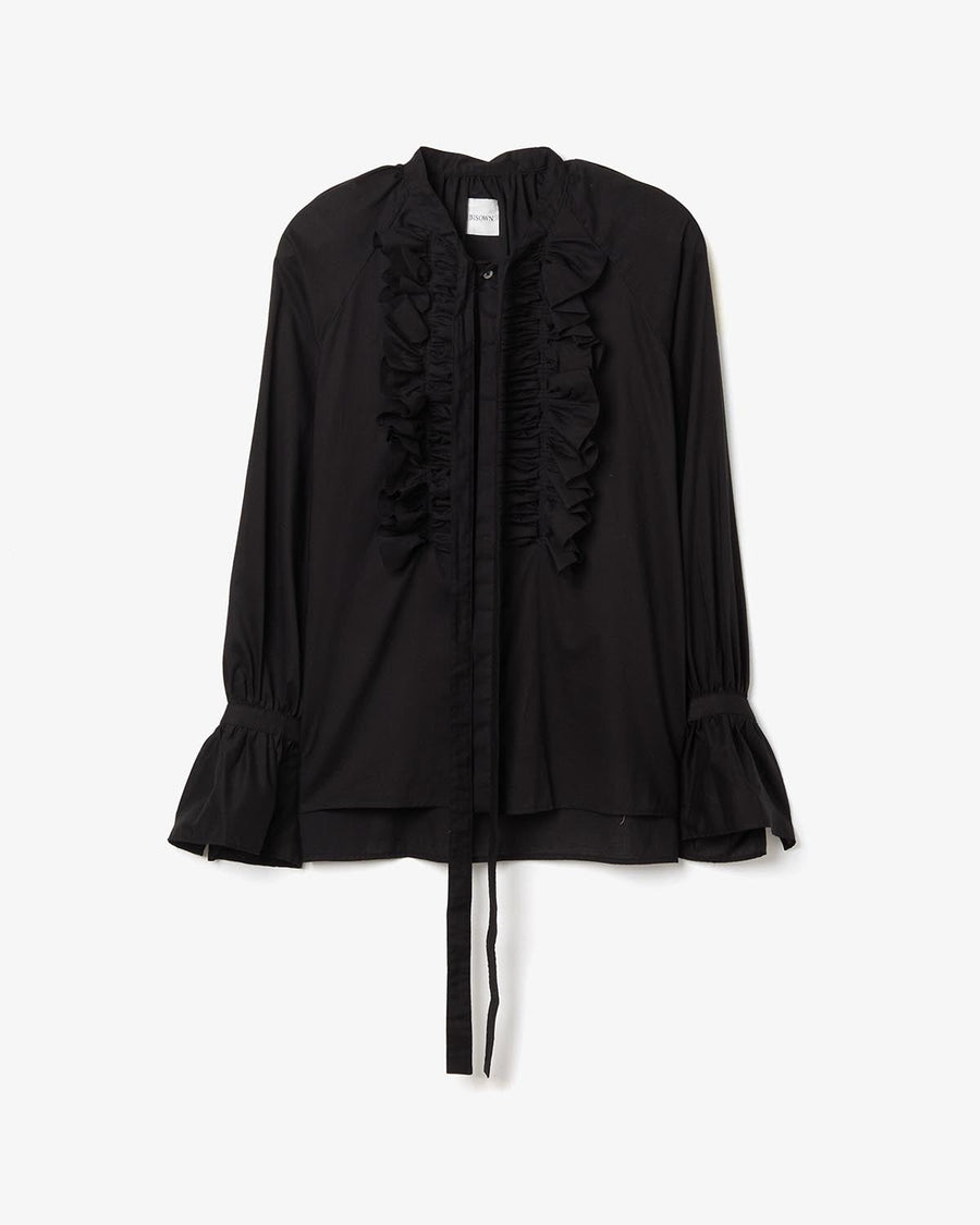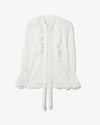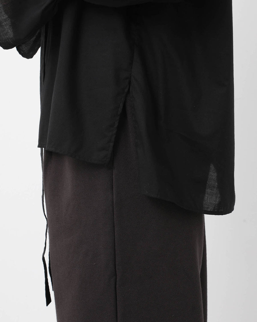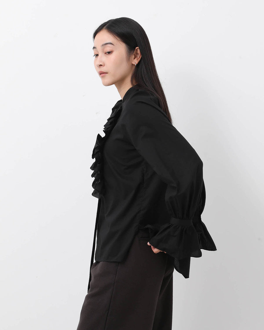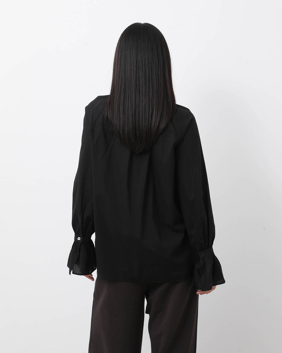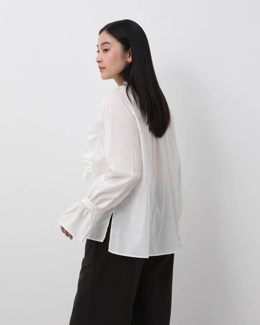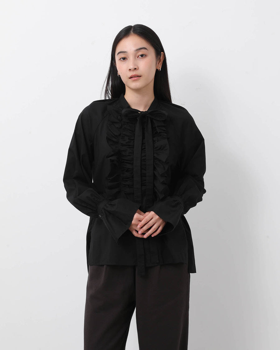 This blouse is crafted from cotton-silk lawn, woven and dyed in Hamamatsu, Shizuoka. Featuring a voluminous front frill with random pintucks, a long ribbon, and pronounced cuffs, it blends a masculine silhouette with elegant details.