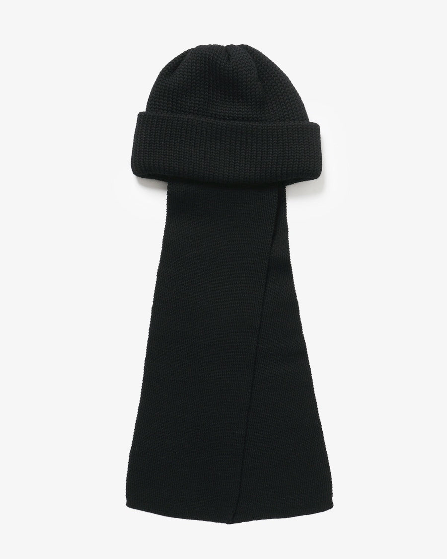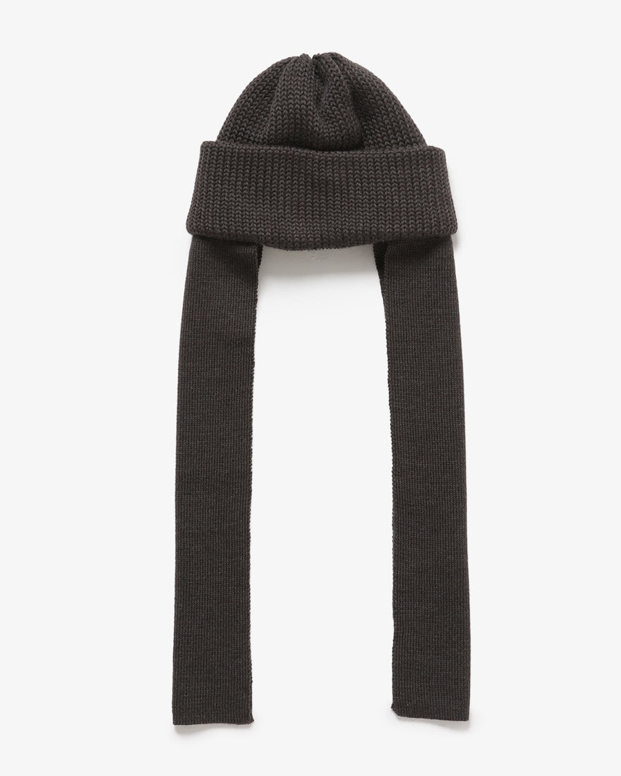 A classic 3-gauge knit cap made from fine merino wool, featuring attached scarf-like extensions that can be worn loose, tied, or tucked in. A playful yet practical design combining hat and scarf in one.