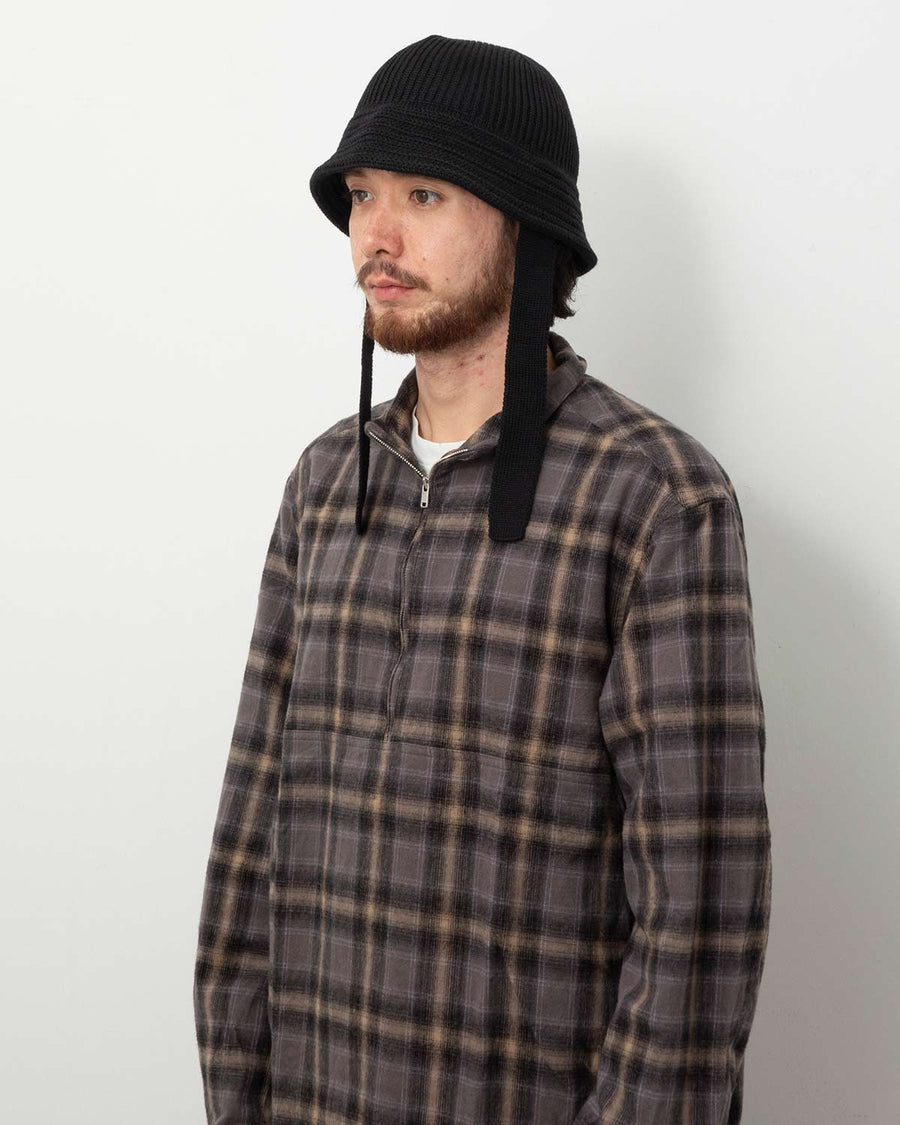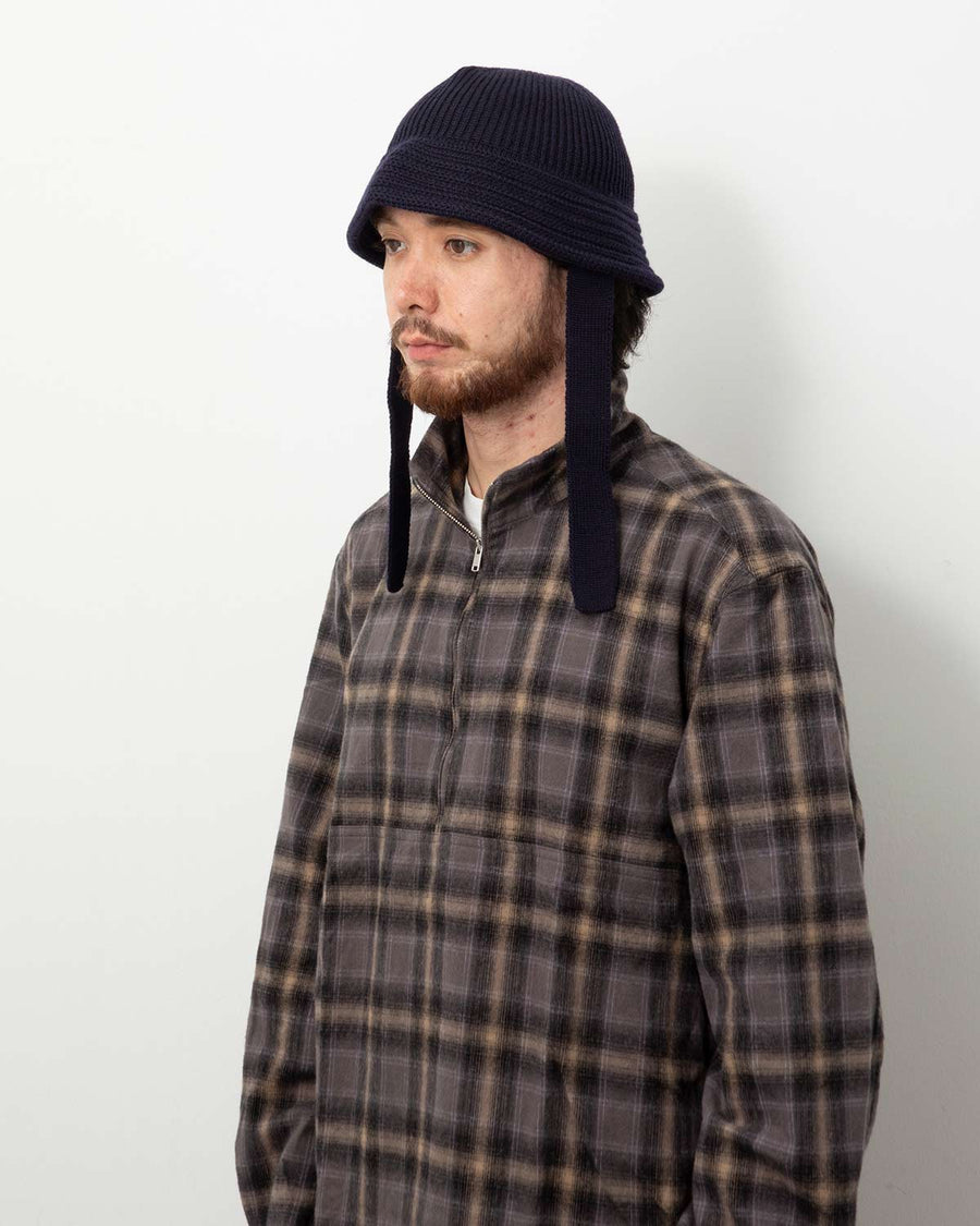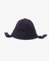 7-gauge merino wool knit hat with rounded crown and ties, wearable loose or tied. Contrasting knits on crown and brim add dimension.