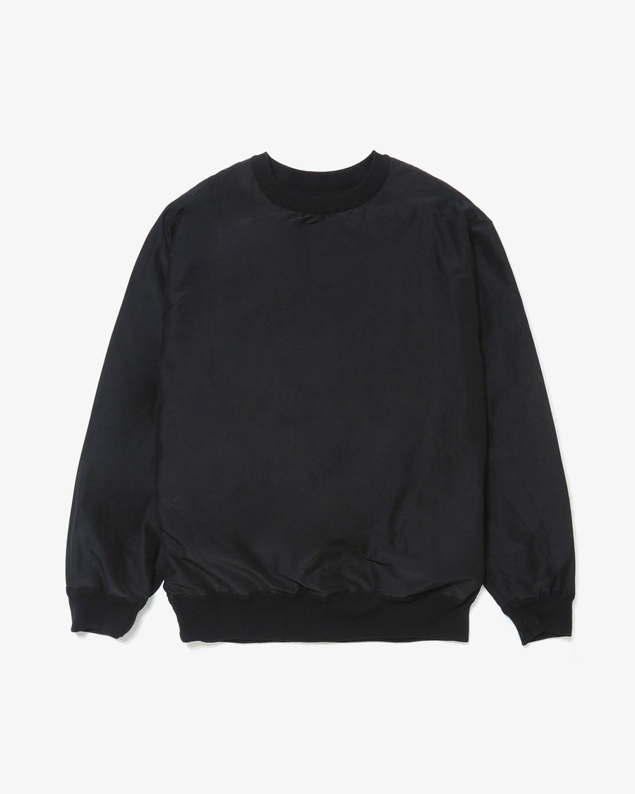 A reversible pullover with a slightly glossy cotton exterior and a cotton-silk knit interior, featuring a rounded, voluminous shape for easy movement.