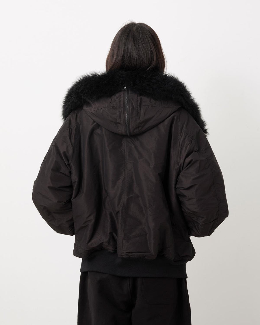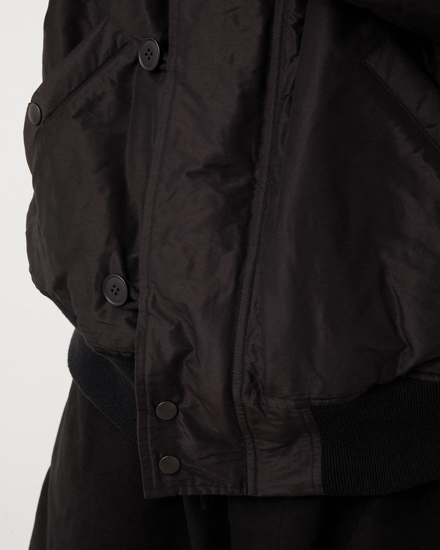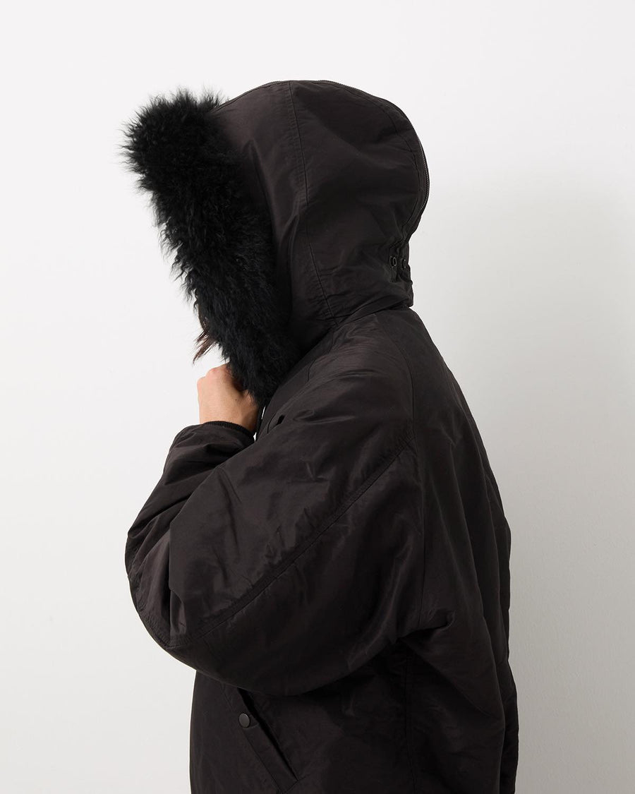 This hooded jacket is crafted from a cotton-silk blend fabric with a crisp texture and refined sheen.Inspired by military design, it features padded insulation and a rounded silhouette that gives it a soft, urban feel.