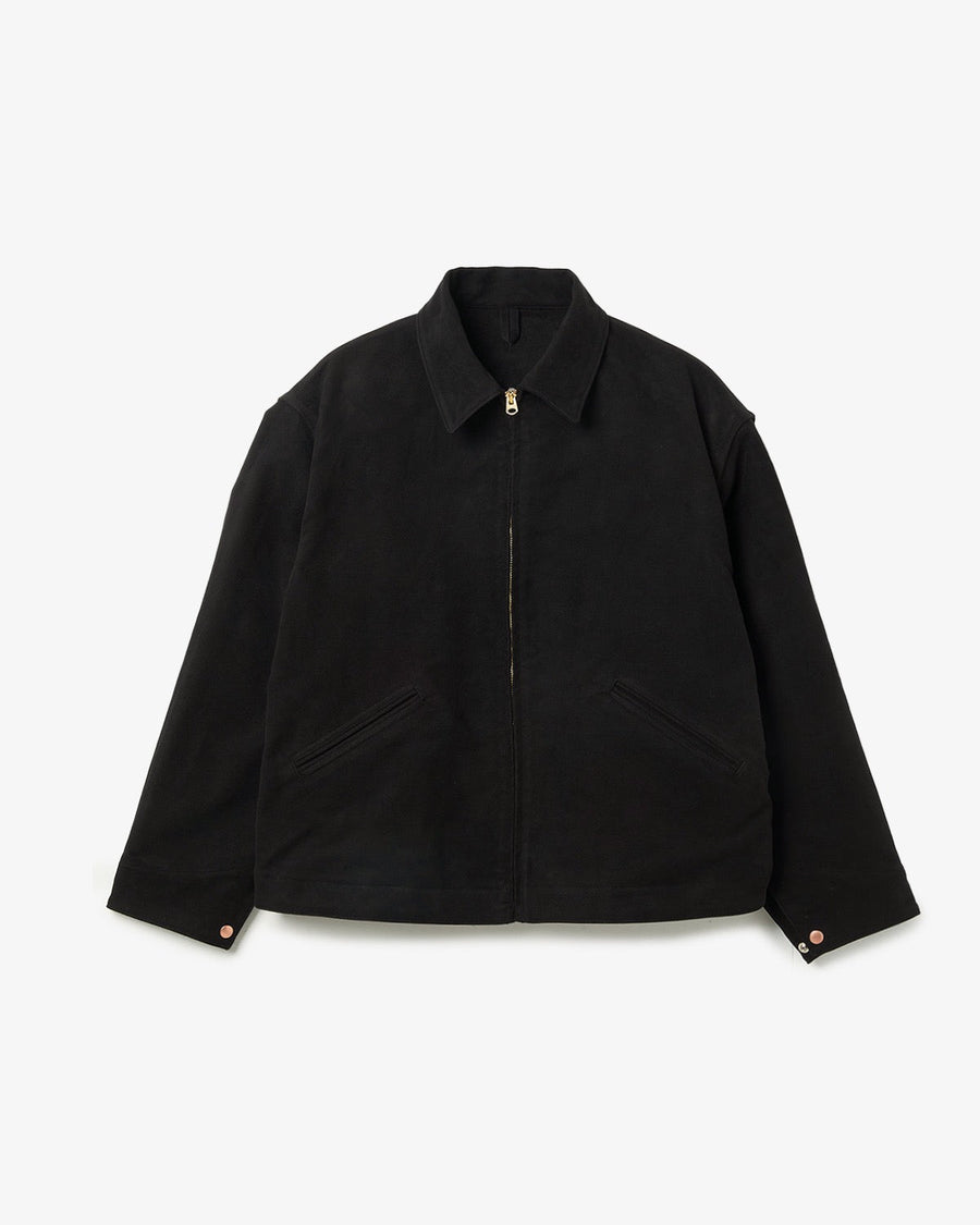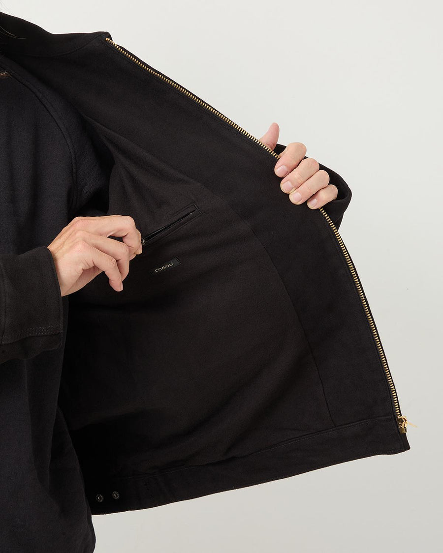 A zip-up short jacket crafted from thick black moleskin with a subtle sheen.