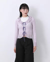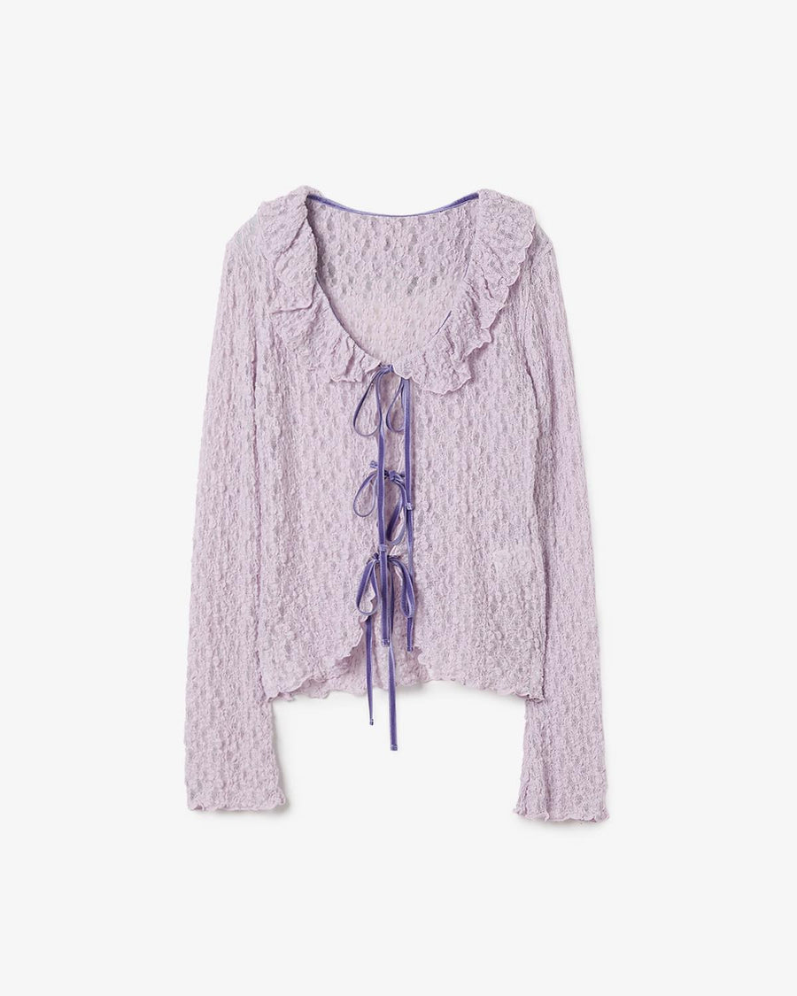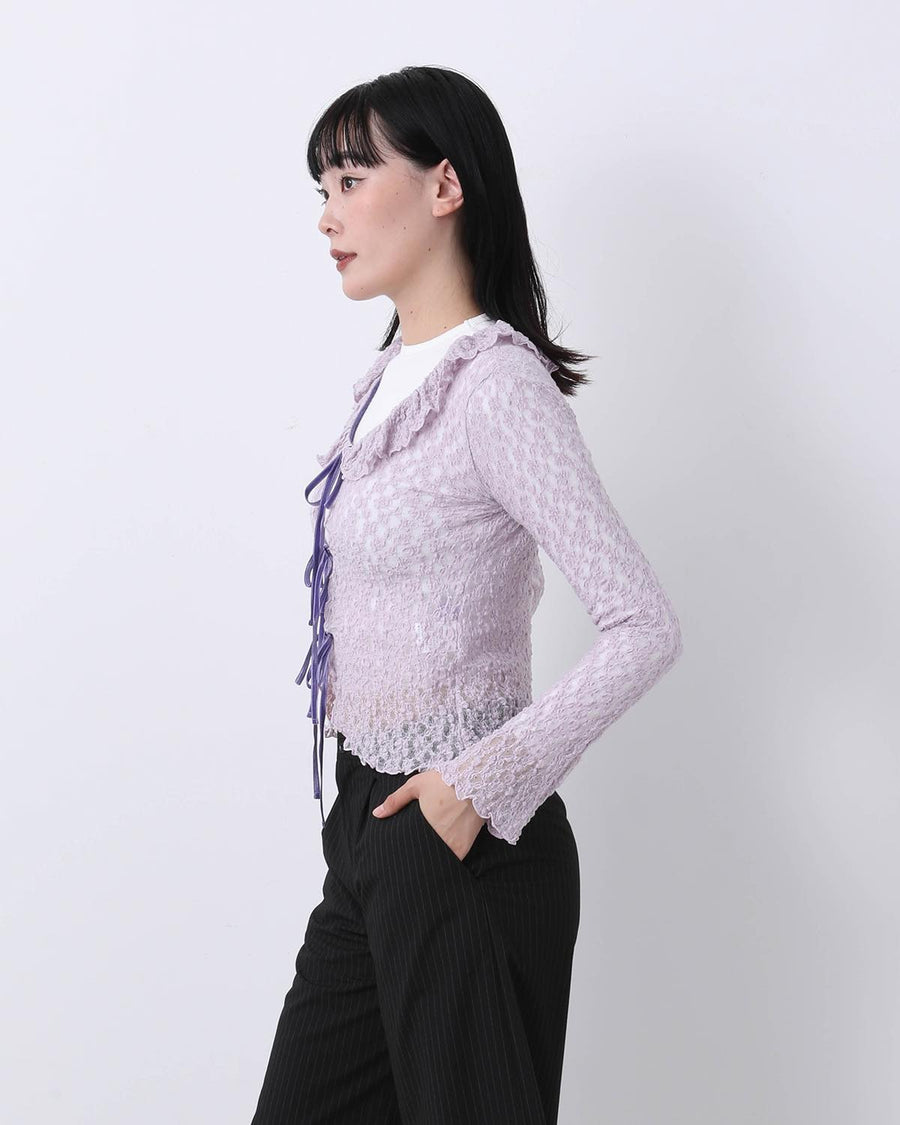 A ribbon blouse featuring a healthy sheer look and triple ribbons.