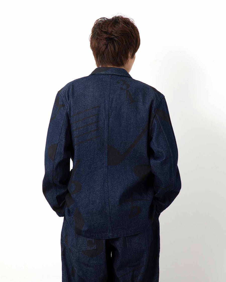 The BEDFORD JACKET features a unique MUSIC NOTE print, peaked lapels, and workwear-inspired details with reinforced areas and vintage-style buttons.