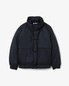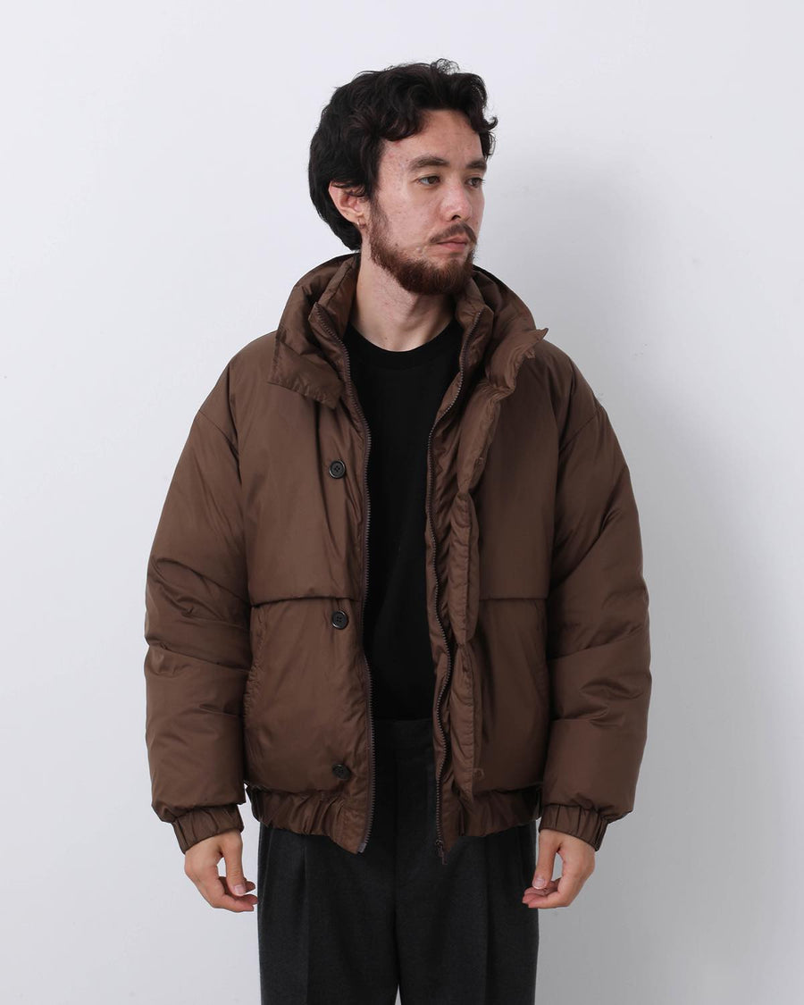 Matte nylon taffeta down jacket with soft cotton-like touch, durable water repellent finish, high-density taffeta lining, and functional hood and pockets.