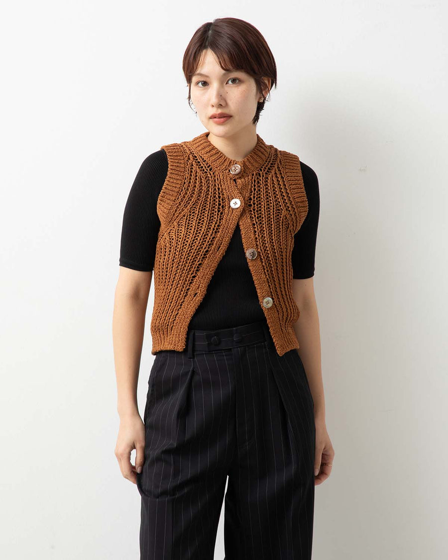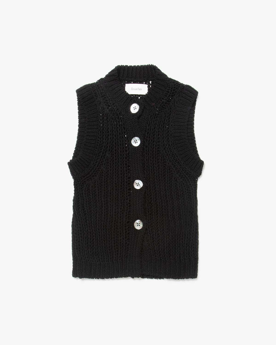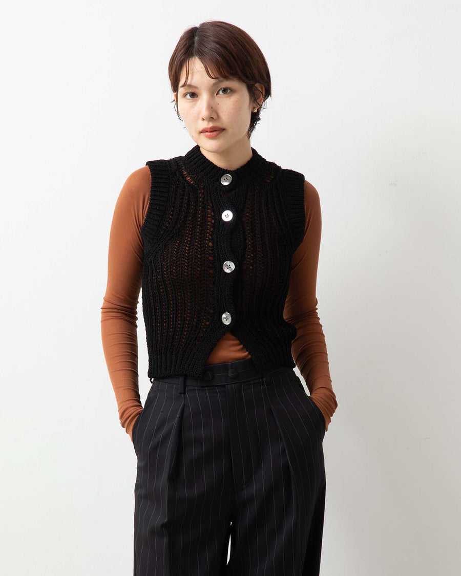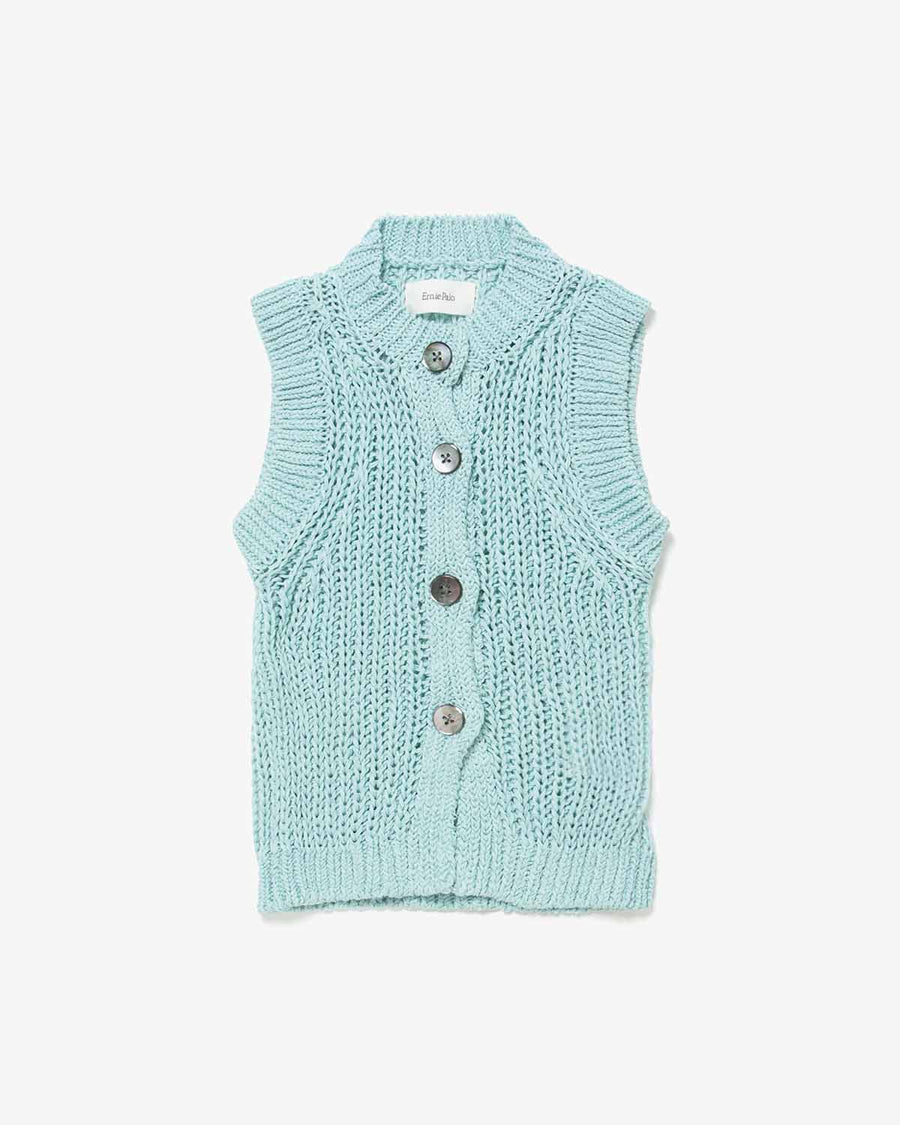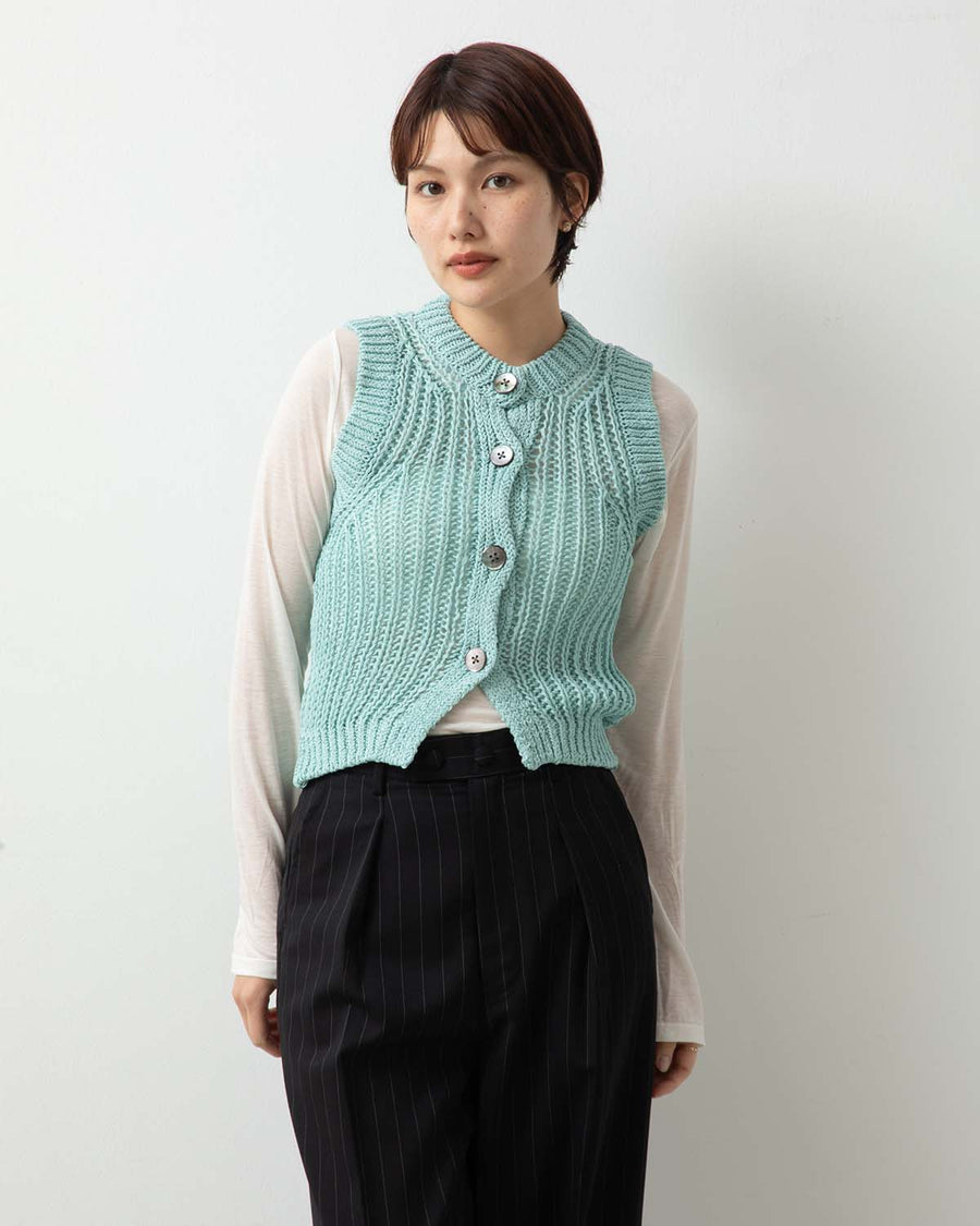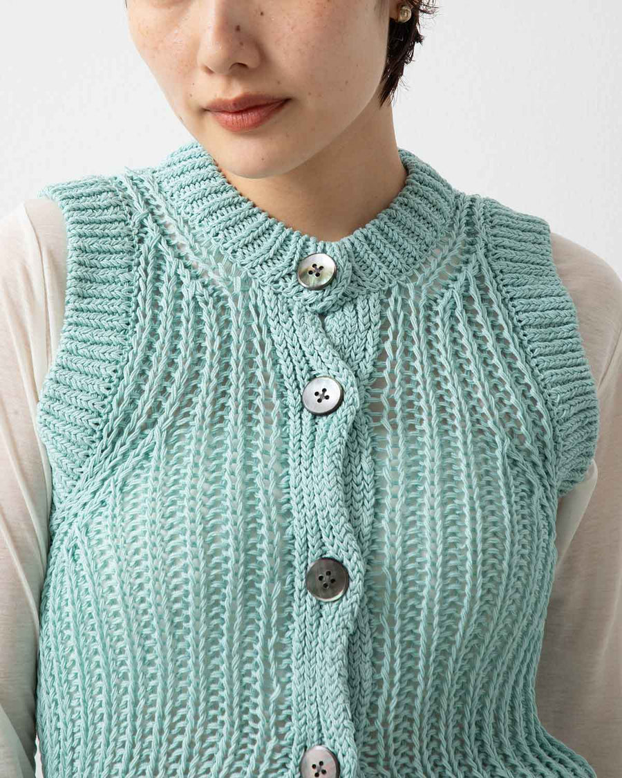 A mesh knit vest made with cotton in a soft tension, featuring large buttons on the front as an accent.