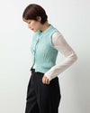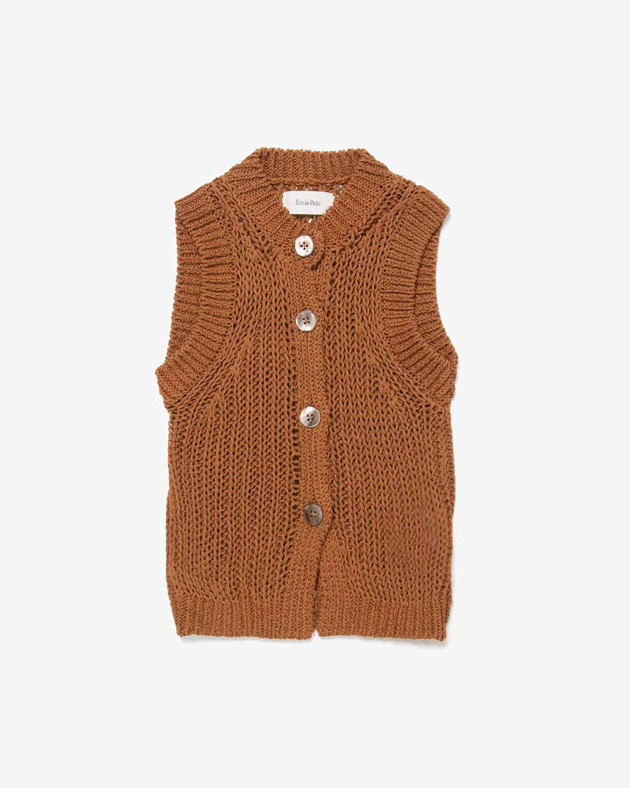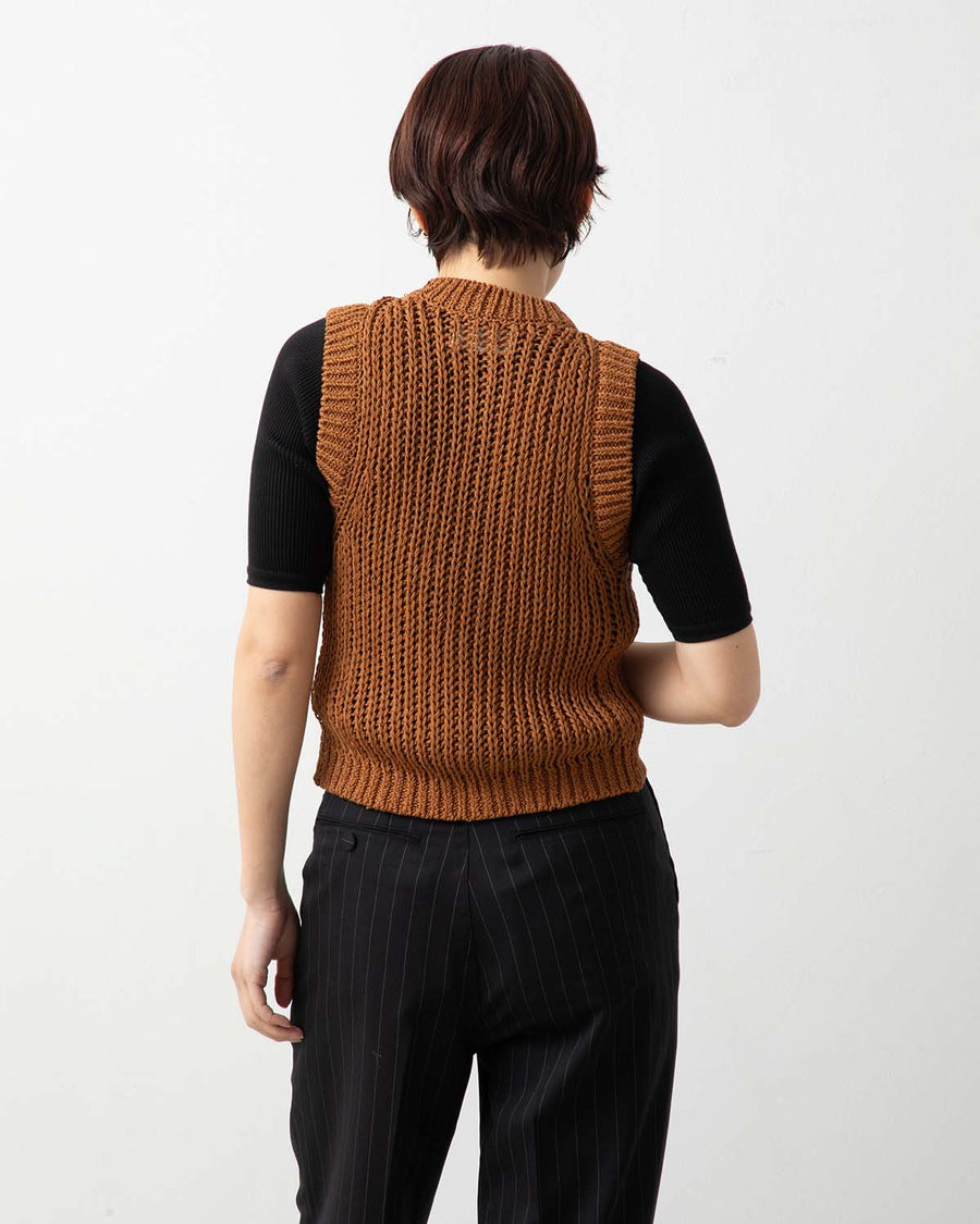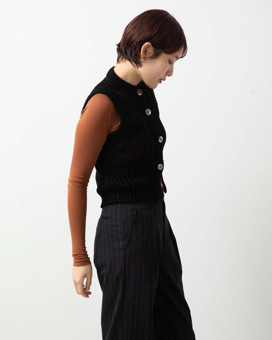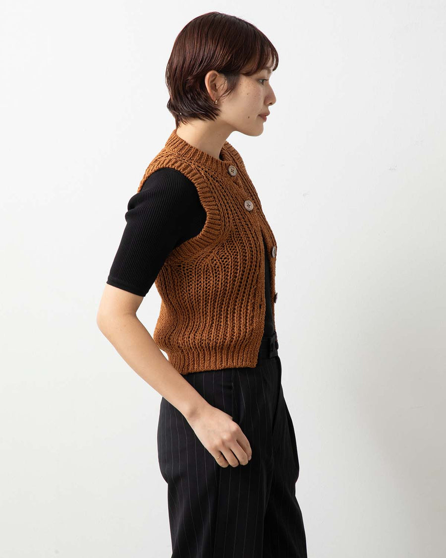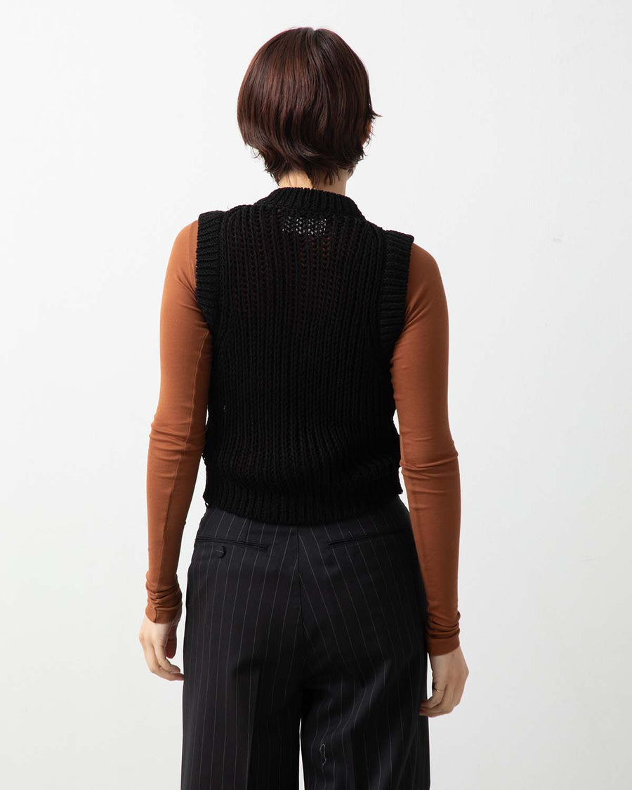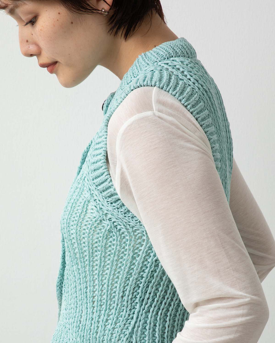 A mesh knit vest made with cotton in a soft tension, featuring large buttons on the front as an accent.