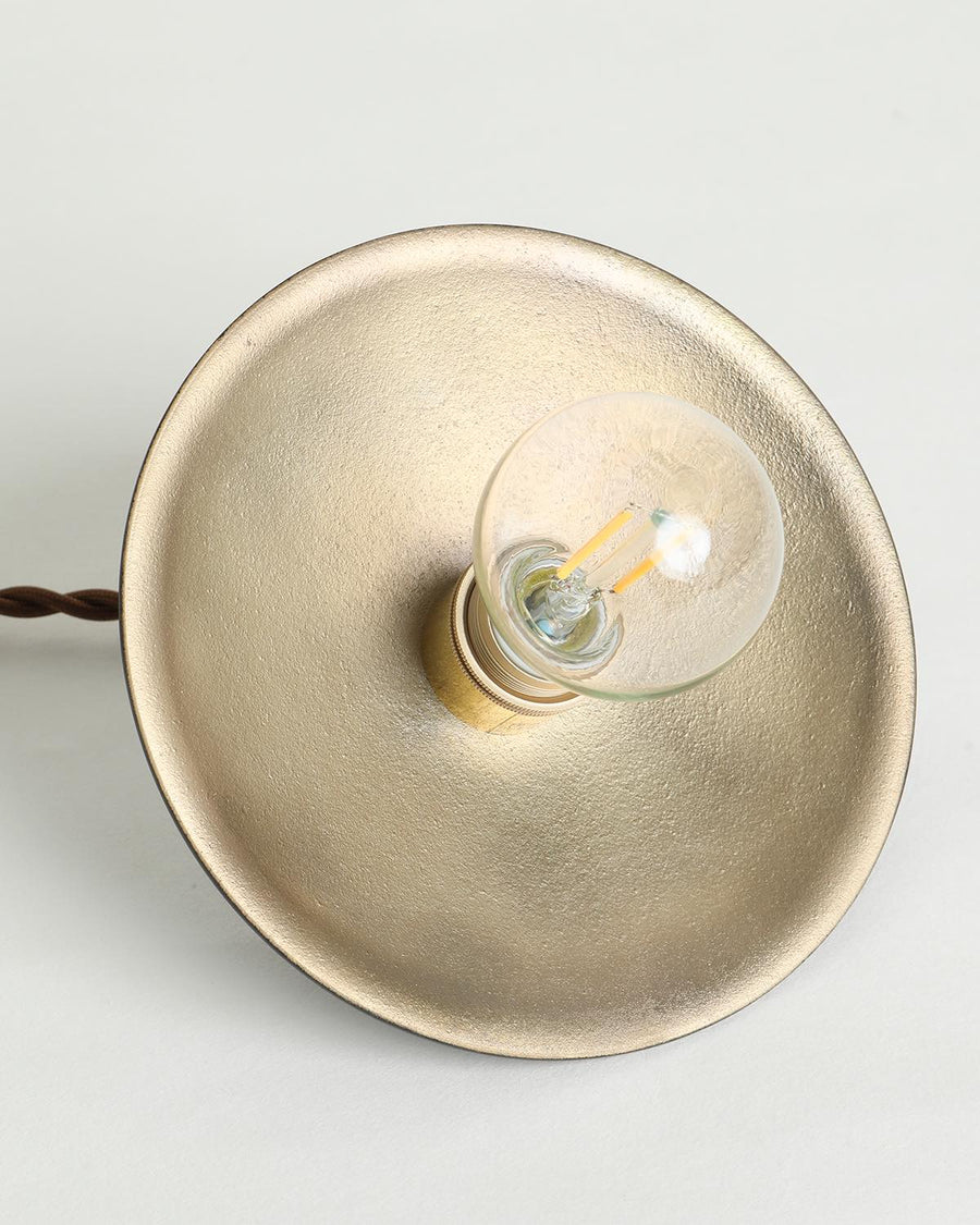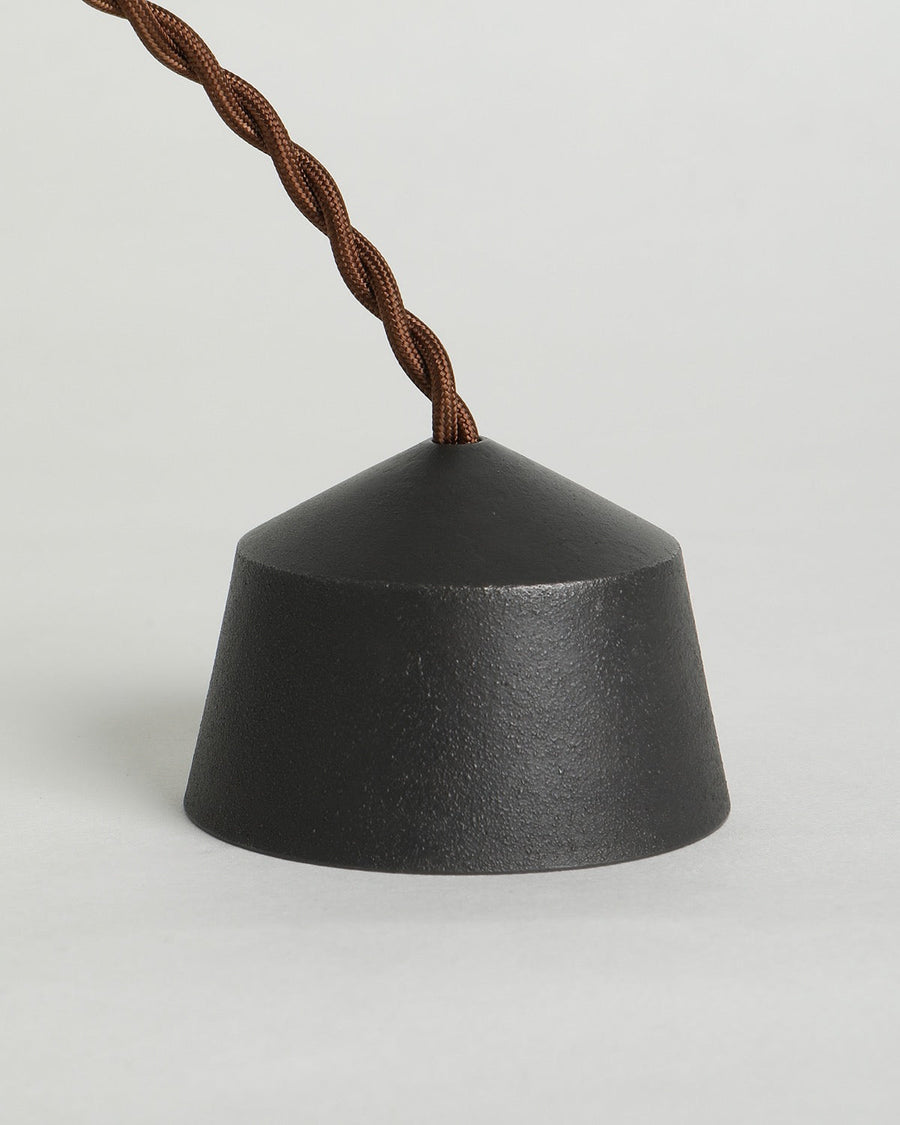 This lamp features a compact form with a timeless and nostalgic appeal. The "Black Mura" coating, resembling ancient excavated artifacts, provides a unique warm expression to the metal. The interior is carved to enhance light reflection.