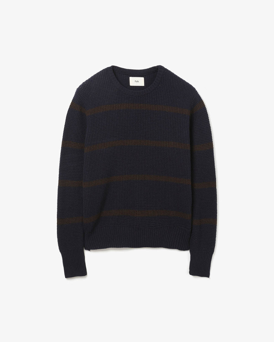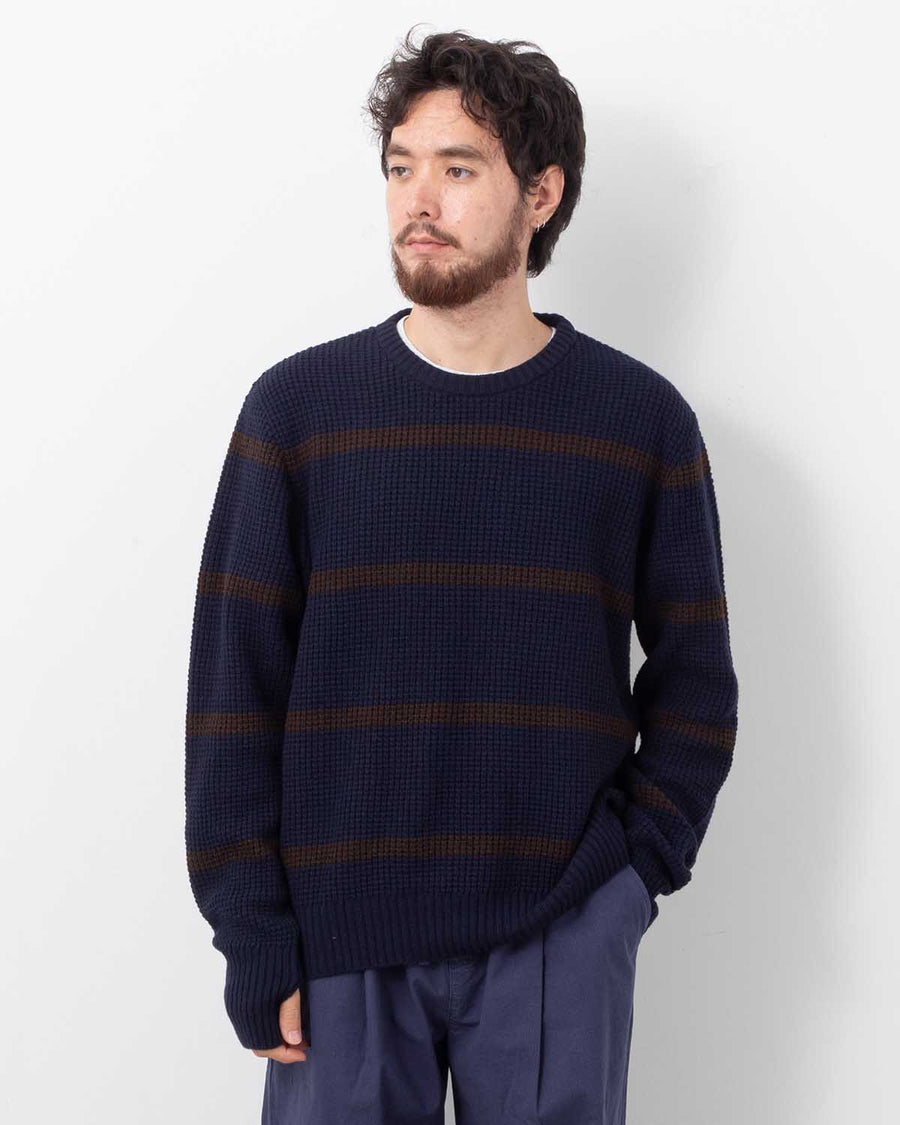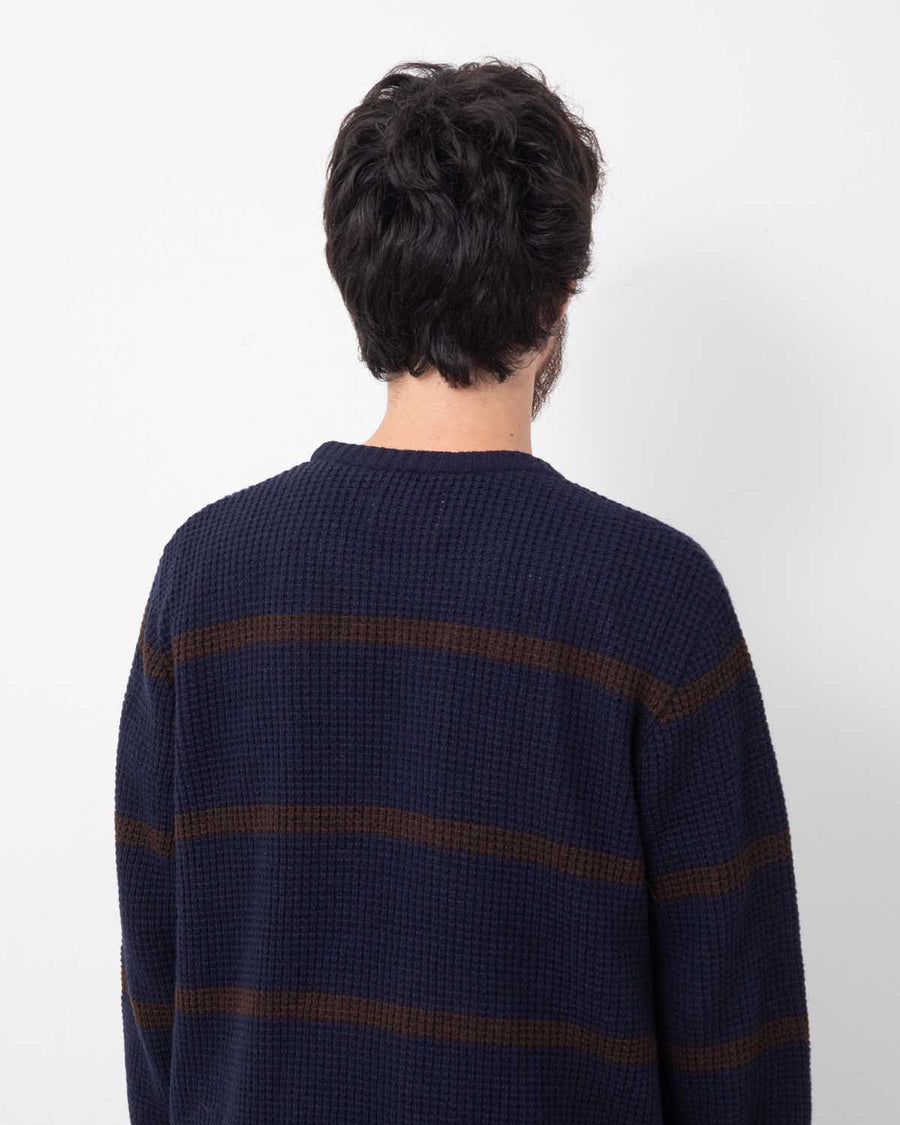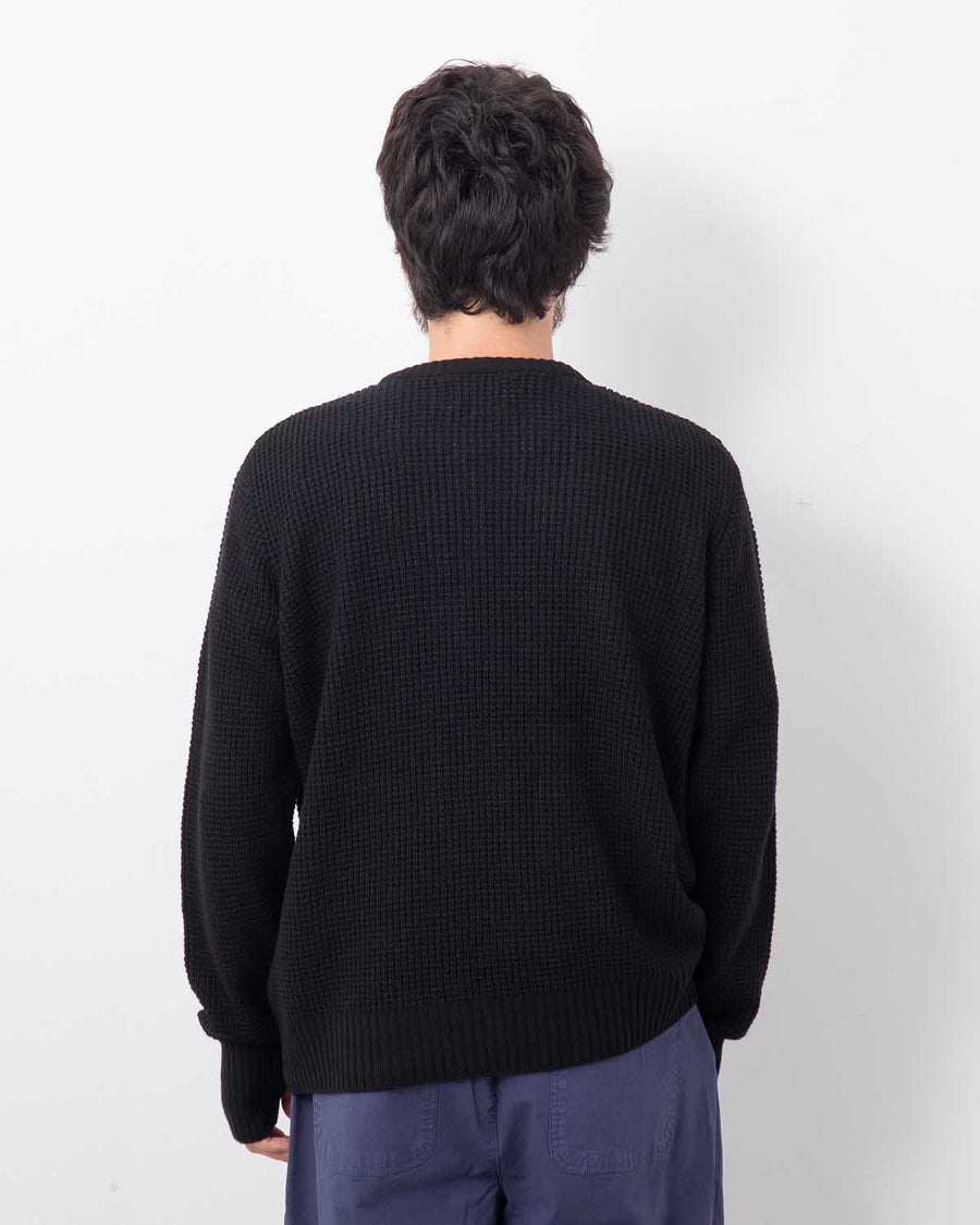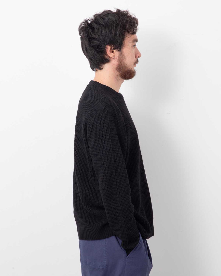 A waffle-knit crewneck sweater with a boxy, slightly fitted silhouette.
